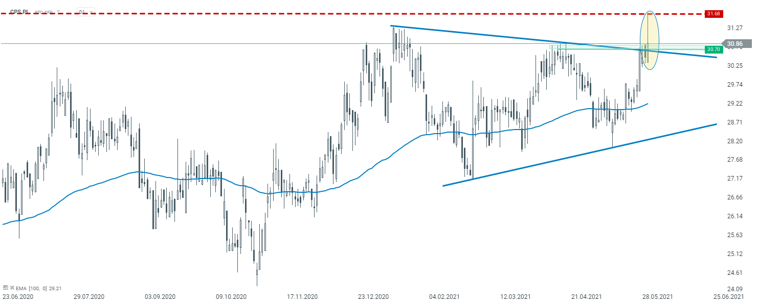 Spójrzmy jeszcze jak prezentuje się wykres notowań Cyfrowego Polsatu (CPS.PL), gdzie możemy obserwować próbę opuszczenia formacji trójkąta, pochodzącej z klasycznej analizy technicznej. Po przekroczeniu górnego ograniczenia wspomnianej struktury, notowania wystrzeliły w górę. Jednak kupujący odpuścili tuż przed poziomem historycznych maksimów (31,68 zł), które zostały ustanowione w 2019 roku. Aktualnie kluczowe będzie to, czy kurs zdołał do końca dnia utrzymać się powyżej poziomu 30,70 zł. Jeśli tak, nie wykluczony jest kolejne podejście pod ostatnie maksima. W przeciwnym razie, powrót poniżej może oznaczać chęć pogłębienia korekty.
