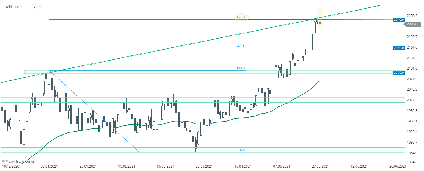 Jeśli chodzi o wykres WIG20 (W20), notowania ponownie znalazły się na najwyższych poziomach w tym roku. Euforia nie trwała jednak długo, inicjatywę szybko przejęła podaż, przez co na interwale D1 może budować się formacja spadającej gwiazdy. Warto zauważyć, że tworzy się ona na wysokości ważnego oporu, który wynika z położenia mierzenia zewnętrznego 161,8% Fibonacciego oraz górnego ograniczenia kanału wzrostowego z interwału W1. W przypadku gdyby wspomniany sygnał przyczynił się do pogłębienia korekty, jako najbliższe wsparcie należy traktować poziom 2160 pkt, wynikający z biegunowości pokonanego wcześniej współczynnika 127,2% Fibo. Kolejne warte uwagi miejsce znajduje się z kolei przy 2090 pkt, gdzie wypadają wcześniejsze reakcje cenowe.