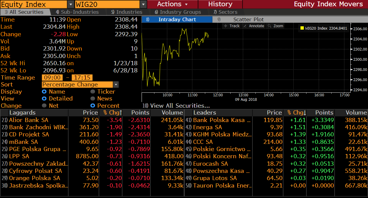 Czwartkowa sesja nie rozpoczęła się w najlepszych nastrojach. Po neutralnym otwarciu w Europie, sesję na indeksie polskich blue chipów rozpoczęliśmy poniżej poziomu 2300 pkt. Z pewnością nastrojom nie pomagał wzrost awersji do ryzyka spowodowany kolejnymi napięciami oraz osłabienie złotego. Po dwóch godzinach docieramy jednak ponownie w kierunku poziomu odniesienia, więc wydaje się, że dzisiejsza sesja również nie przyniesie istotnych rozstrzygnięć.
