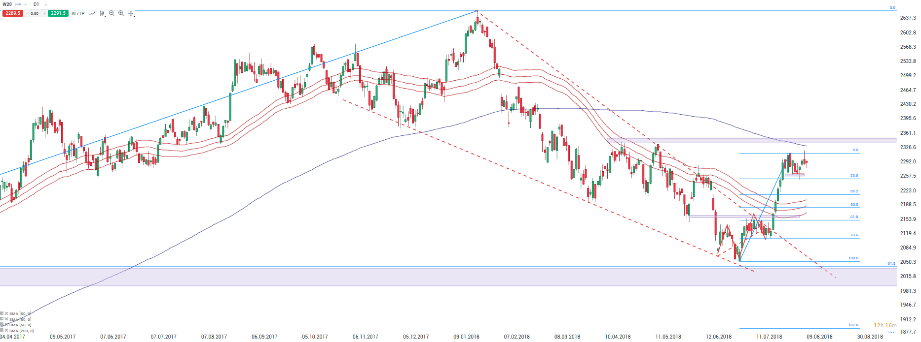 Na wykresie dziennym po wczorajszym ataku na lipcowe maksima nie ma już śladu. Czynnikiem ryzyka dla zapoczątkowania głębszej korekty z tego poziomu jest z pewnością osłabiający się złoty. Głównym oporem dla byków może być średnia 200-sesyjna oraz wiosenne maksima. Krótkoterminowym wsparciem pozostają okolice 2260 pkt., które powstrzymały spadki w ostatnich dniach.