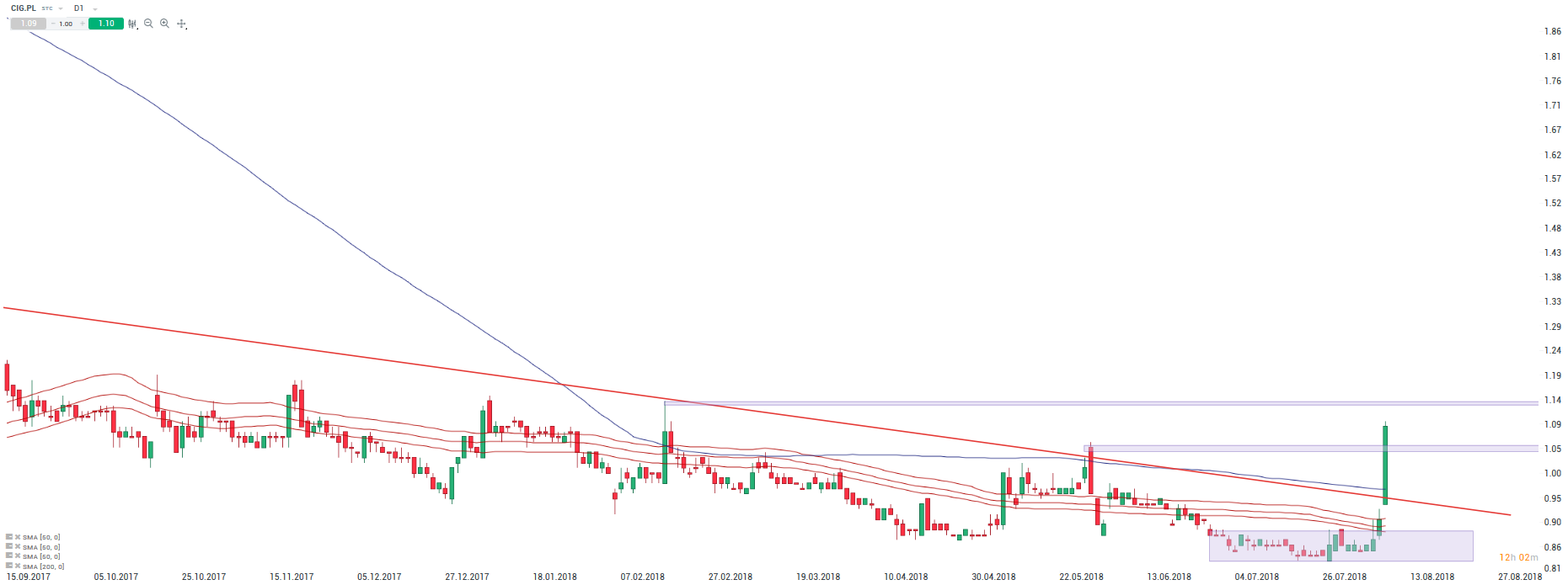 Dzisiejsza sesja jest bardzo udana dla posiadaczy akcji Ci Games (CIG.PL). Kurs po marazmie w ostatnich miesiącach zdecydowanie wychodzi górą z ostatniej konsolidacji. Źródło: xStation5.