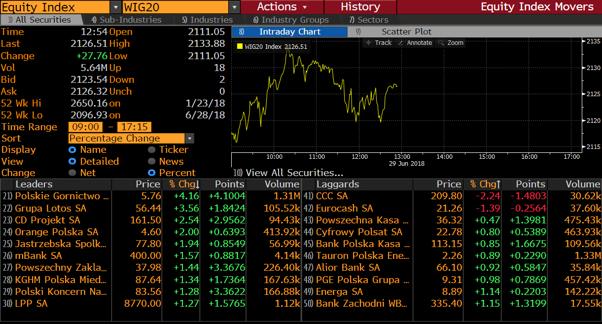 Najlepszą branżą na warszawskim parkiecie są spółki paliwowe. Jedną z najmocniej rosnących walorów jest Lotos (LTS.PL), który rośnie ponad 3,4%. Dobrze radzą sobie również spółki takie jak: PGNIG (PGN.PL), CD Project (CDR.PL) i Orange (OPL.PL). Tylko dwa komponenty znajdują się dzisiaj na minusie. Są to walory CCC (CCC.PL) i Eurocash (EUR.PL), które tracą odpowiednio -2,2% i -1,4%.