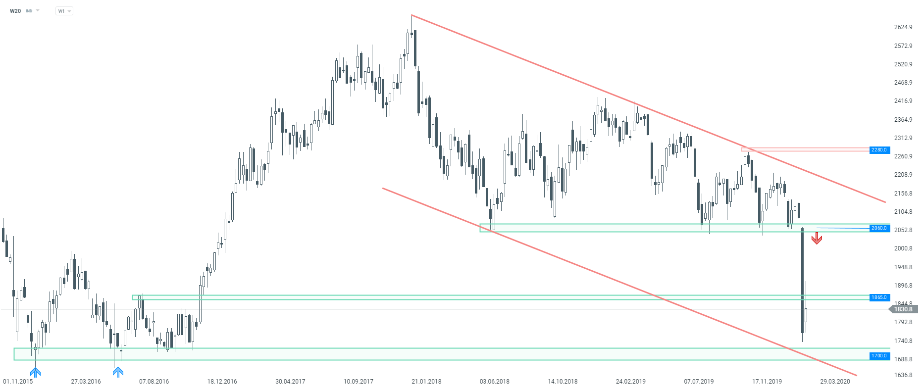 Sytuacja techniczna na W20 pozostaje bez większych zmian. We wczorajszym pulsie GPW pisaliśmy o tym, że wyjście powyżej strefy przy 1865 pkt może być nietrwałe i żeby mówić o sygnale zakupowym trzeba poczekać na zamknięcie tygodnia. Utrzymujemy to podejście, dopóki świeca W1 nie zamknie się powyżej wspomnianej strefy przy 1865 pkt, wciąż możliwy jest dalszy ruch spadkowy. W przypadku kontynuacji spadków kluczowym wsparciem pozostaje strefa przy 1700 pkt.