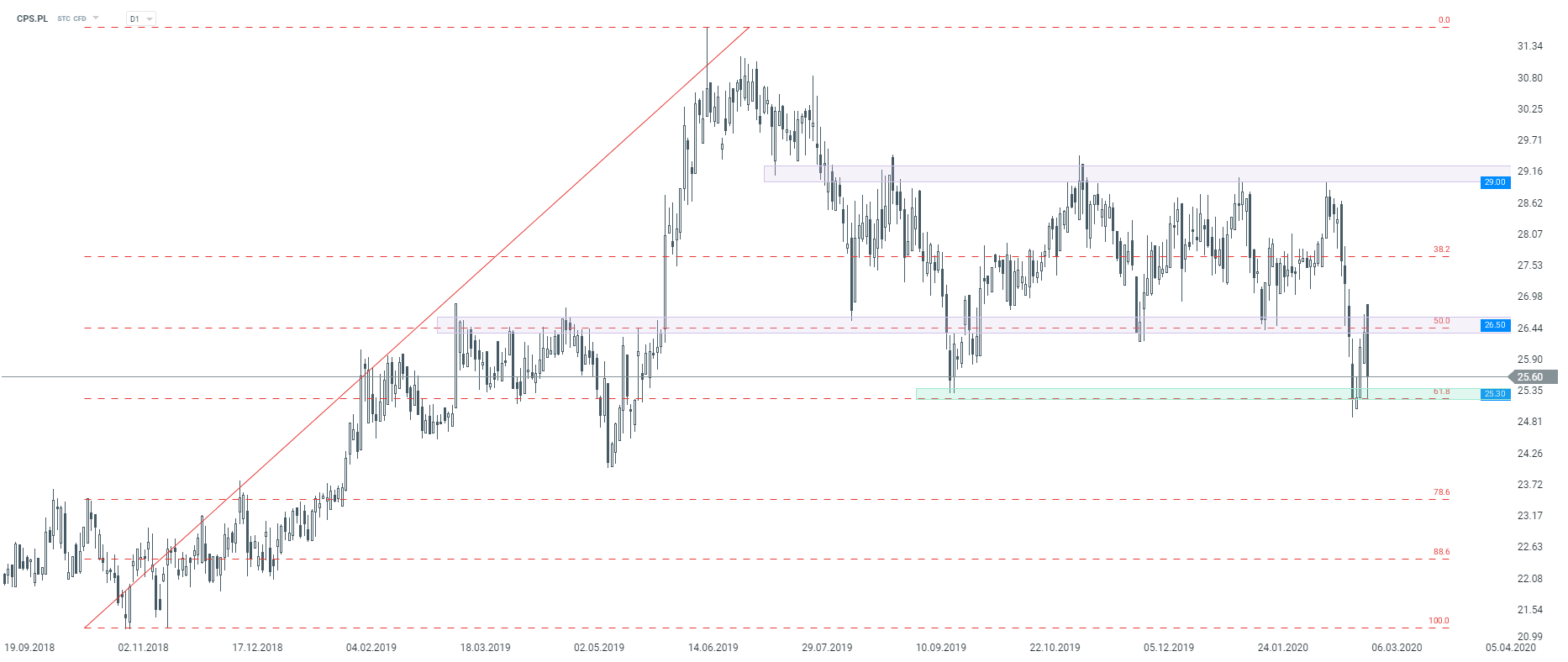 Oprócz wspomnianych wyżej spółek, nie najlepiej radzi sobie dziś Cyfrowy Polsat (CPS.PL), który w pewnej chwili tracił ponad 4%. Przecenę widać w całym indeksie WIG-Telekom, który straci około 2%, a ma to związek z opublikowaniem przez Urząd Komunikacji Elektronicznej stanowiska w ramach drugiej rundy konsultacji aukcji, z których wynika, że operatorzy telekomunikacyjni chcą niższej ceny wywoławczej w aukcji 5G. Patrząc jednak techniczne na wykres CPS.PL, dzisiejsza przecena dotarła do kluczowego poziomu wsparcia, gdzie widać już reakcję kupujących. Strefa przy 25,30 zł wynika z piątkowych minimów, a także dołka z września 2019 roku. Poziom ten jest dodatkowo potwierdzony mierzeniem 61,8%, wyznaczonym na całej ostatniej fali wzrostowej, licząc od dołków z listopada 2018 roku. Większe wzrosty na spółce powinny się pojawić w momencie ponownego wyjścia powyżej strefy przy 26.5 zł. Jeżeli jednak wsparcie przy wspomnianym poziomie 25,30 zł zostałyby pokonane, droga do większej przeceny zostanie otwarta.