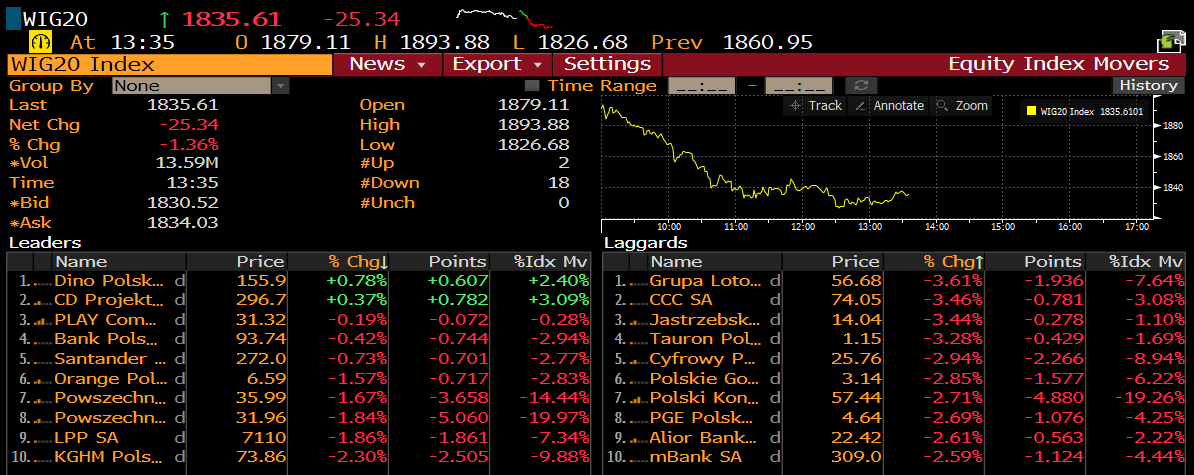Po silnej przecenie z jaką mieliśmy do czynienia przed weekendem, pierwsze dwa dni nowego tygodnia rozpoczęły się w bardzo dobrych nastrojach. Niemniej po ponad 6% ruchu w górę, WIG20 wrócił w środę do spadków, a dziś ruch w dół jest kontynuowany. Podczas czwartkowej sesji indeks dwudziestu największych spółek w Polsce traci 1,4%, a biorąc pod uwagę słabe nastroje na europejskich parkietach, istnieje szansa na pogłębienie przeceny. Patrząc na indeks największych spółek, tylko 2 z 20 znajdują się na plusie, są to CD Projekt i Dino Polska. Najgorzej podczas czwartkowej sesji radzą sobie Lotos, Tauron i CCC, gdzie spadki przekraczają granicę 3%.