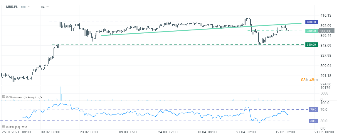 Przyjrzyjmy dziś wykresowi spółki Mo-Bruk (MBR.PL) - przedsiębiorstwa z obszaru gospodarki odpadami. Jak widać na wykresie (tutaj interwał H4), na początku maja doszło do dosyć gwałtownej korekty i kurs spadł poniżej poziomu 400 zł, docierając w rejony 350 zł. W ostatnich dniach kupujący przystąpili jednak do odrabiania strat, choć dziś ruch wzrostowy został wstrzymany - jak opór zadziałała linia poprowadzona po korpusach świec z okresu luty-marzec - można ją zatem uznać za techniczny opór. Niemniej kluczowymi poziomami w nieco szerszej perspektywie wydają się: 400 zł (opór) oraz 350 zł (wsparcie).