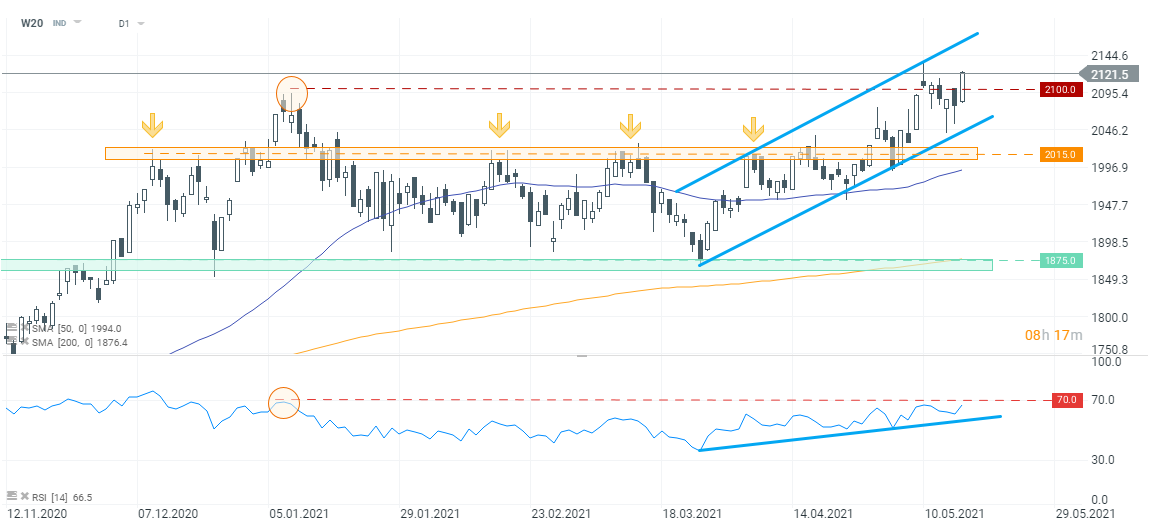 Mo-Bruk (MBR.PL), interwał H4. Źródło: xStation5Indeks WIG20 (W20) znów znalazł się powyżej bariery 2100 pkt, próbując zbliżyć się do szczytów intraday z zeszłego poniedziałku. Indeks cały czas znajduje się wewnątrz kanału wzrostowego, respektując sekwencję coraz wyższych dołków i szczytów (patrząc na ceny otwarcia i zamknięcia) - trend w krótkim terminie pozostaje wzrostowy. Najbliższy poziom oporu moga stanowić okolice 2135 pkt (dzienne maksima z 10 maja) - wsparciem pozostaje zaś dolne ograniczenie kanału, a następnie - kluczowa bariera 2015 pkt.