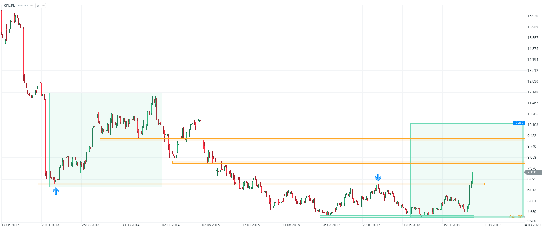 Wyraźne wzrosty na spółce Orange Polska możemy obserwować właściwie już od połowy maja. Jeszcze na początku ubiegłego miesiąca kurs akcji znajdował się wyraźnie poniżej poziomu 5 zł, dziś jest to już ponad 7 zł. W ostatnim tygodniu cenie udało się wyjść powyżej kluczowej strefy oporowej. Musimy tutaj wejść na interwał W1, jak widać strefa zaznaczona kolorem żółtym wypadająca w rejonach 6,4 zł stanowiła w przeszłości zarówno klczowy opór jak i wsparcie. Pokonanie tego miejsca świadczy o wyraźnej przewadze kupujących, dlatego też dopóki cena znajduje się powyżej, oczekuje się dalszych wzrostów. Wybity poziom powinien w przypadku korekty spadkowej działać jako wsparcie.