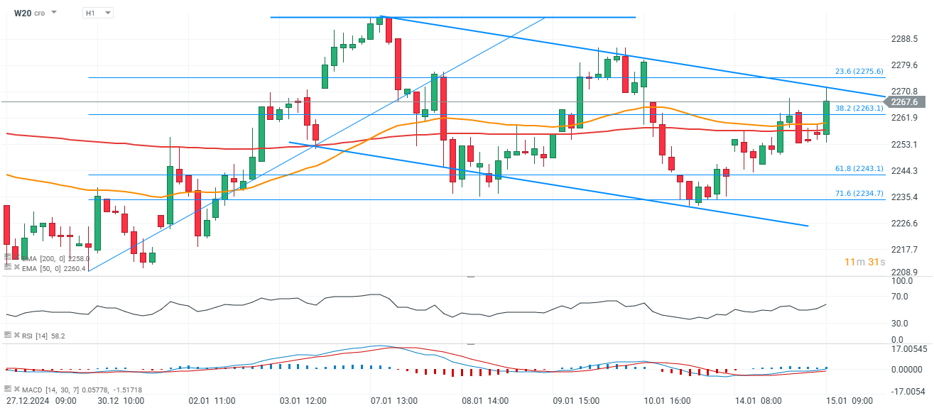 Na interwale godzinowym widzimy, że W20 notowany jest w potencjalnej formacji flagi, z której wybicie górą mogłoby zostać potwierdzone po wzroście powyżej 2280 punktów.