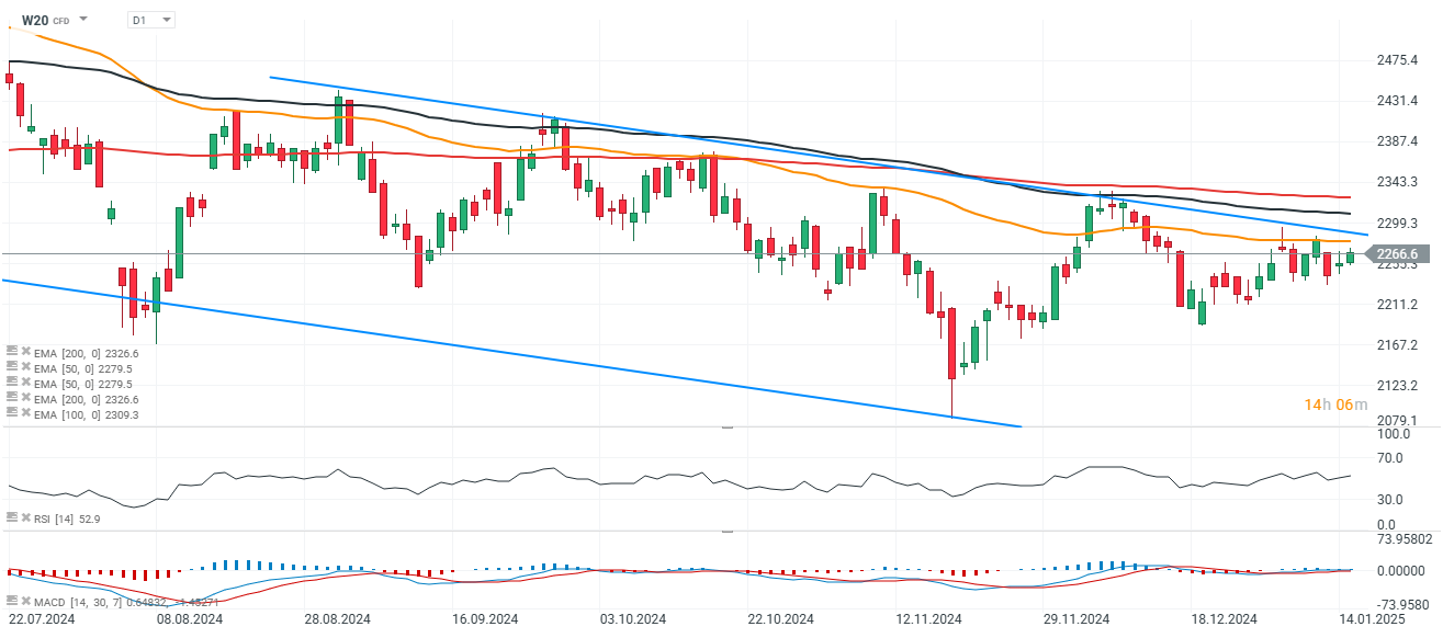Patrząc na interwał dzienny, wciąż dominują sprzedający, a W20 notowany jest poniżej EMA200, gdzie kluczowy opór przebiega w okolicach 2320 punktów.