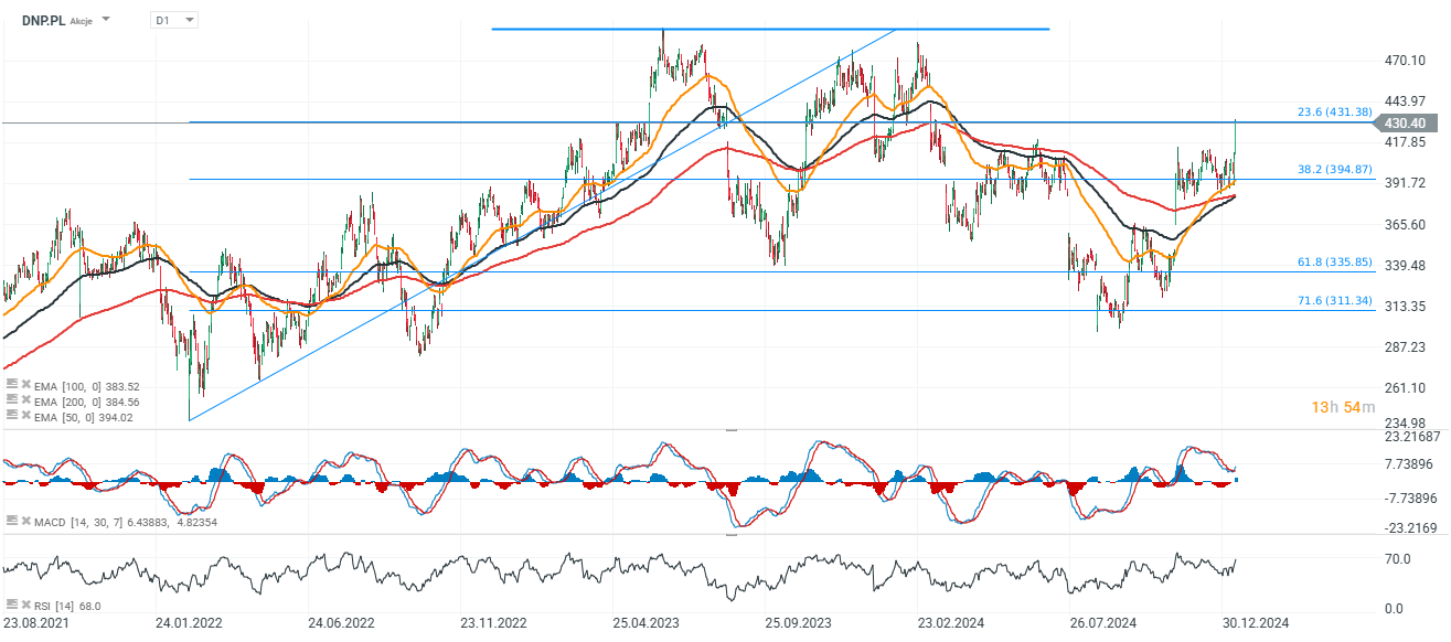 Walory Dino testują dziś 23.6 zniesienie Fibonacciego impulsu wzrostowego z 2022 roku i z przytupem wracają do wzrostowego trendu. Spółce w skali makro sprzyja wzrost płacy minimalnej w Polsce i utrzymująca się pozytywna dynamika wzrostu wynagrodzeń. Akcje notowane są już blisko 10% powyżej EMA200 (czerwona linia); kluczowy opór to lokalne szczyty z 2023 roku, przy 480 PLN za walor. Wolumen handlowy Dino jest dziś 15-krotnie wyższy, od 20-dniowej średniej. W listopadzie poprawa marż w raporcie została przez rynek odebrana jako oznaka 'złagodzenia' wojny cenowej. Udział Goldman Sachs w akcjonariacie Dino to obecnie 3.3%. Zyskuje dziś szerszy, europejski sektor spożywczy; prawie 2% zyskują m.in. akcje Jeronimo Martins (JMT.PT).