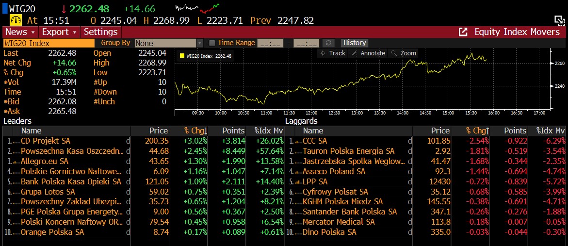 Mieszane nastroje na rynkach europejskich utrzymują się, a większość największych indeksów notuje dzisiaj spadki. WIG20 odrabia część strat i notowany jest blisko poziomu 2260 punktów. Walorami indeksu WIG20, które rosną dzisiaj najmocniej są CD Projekt (+3,02%) oraz PZU (+2,45%). Traci obecnie m.in. CCC (-2,54%) oraz Tauron (-1,81%).