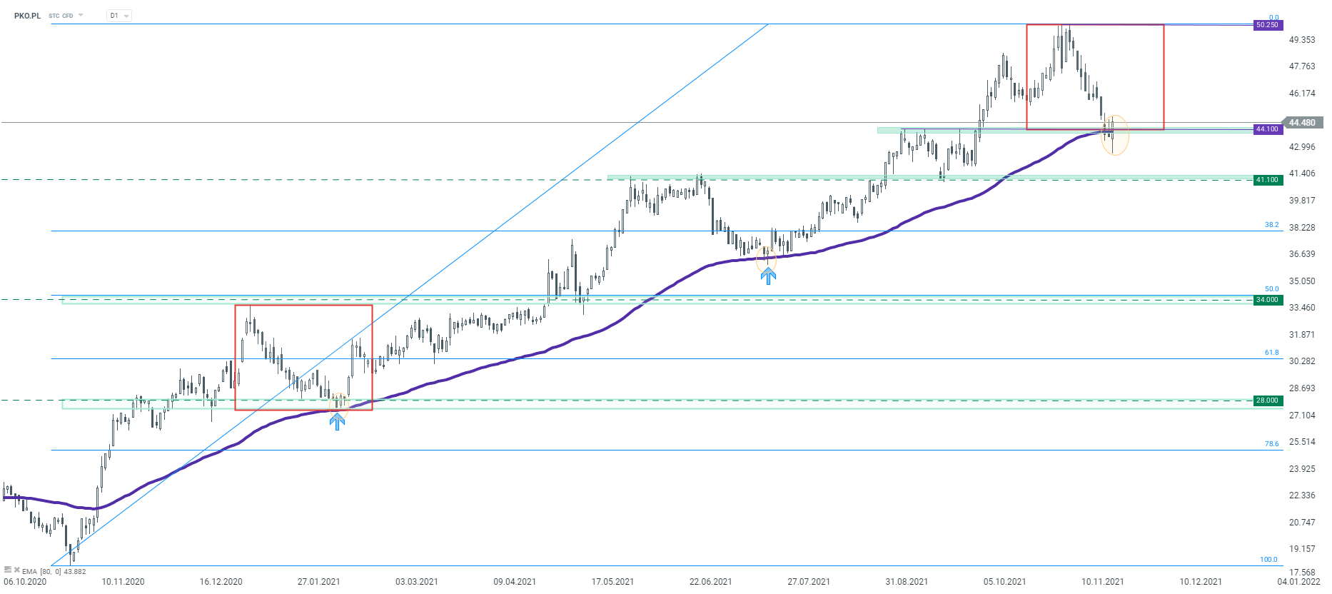 Notowania PKO BP (PKO.PL) reagują na wysokości kluczowego wsparcia. Źródło: xStation5