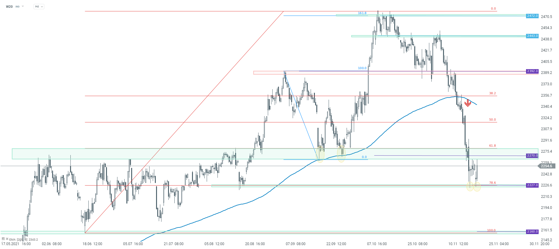 Jeśli chodzi z kolei o sytuację techniczną na WIG20 (W20), notowania głównego indeksu na GPW próbują wyhamować tendencję spadkową. Patrząc na wykres H4, kurs odbił się ponownie od wsparcia przy 2227 pkt, o którym pisaliśmy w poprzednich analizach. Miejsce to wynika z wcześniejszych reakcji ceny, jak i szerokiego mierzenia 78,6% Fibonacciego. Istnieje więc szansa na lokalną formację podwójnego dna. Niemniej aby ruch wzrostowy przyspieszył, kupujący musieliby doprowadzić do sforsowania strefy oporowej przy 2270 pkt.