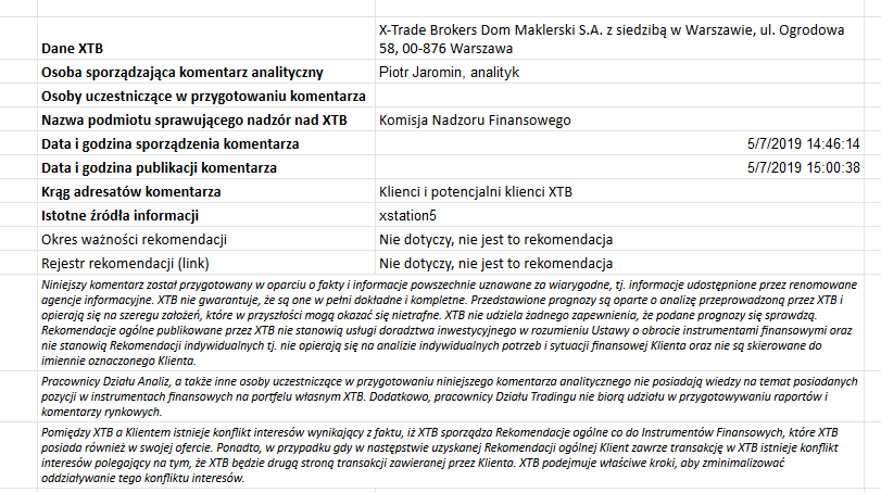Ta publikacja handlowa jest informacyjna i edukacyjna. Nie jest rekomendacją inwestycyjną ani informacją rekomendującą lub sugerującą strategię inwestycyjną. W materiale nie sugerujemy żadnej strategii inwestycyjnej ani nie świadczymy usługi doradztwa inwestycyjnego. Materiał nie uwzględnia indywidualnej sytuacji finansowej, potrzeb i celów inwestycyjnych klienta. Nie jest też ofertą sprzedaży ani subskrypcji. Nie jest zaproszeniem do nabycia, reklamą ani promocją jakichkolwiek instrumentów finansowych. Publikację handlową przygotowaliśmy starannie i obiektywnie. Przedstawiamy stan faktyczny znany autorom w chwili tworzenia dokumentu. Nie umieszczamy w nim żadnych elementów oceniających. Informacje i badania oparte na historycznych danych lub wynikach oraz prognozy nie stanowią pewnego wskaźnika na przyszłość. Nie odpowiadamy za Twoje działania lub zaniechania, zwłaszcza za to, że zdecydujesz się nabyć lub zbyć instrumenty finansowe na podstawie informacji z tej publikacji handlowej. Nie odpowiadamy też za szkody, które mogą wynikać z bezpośredniego czy też pośredniego wykorzystania tych informacji. Inwestowanie jest ryzykowne. Inwestuj odpowiedzialnie.
