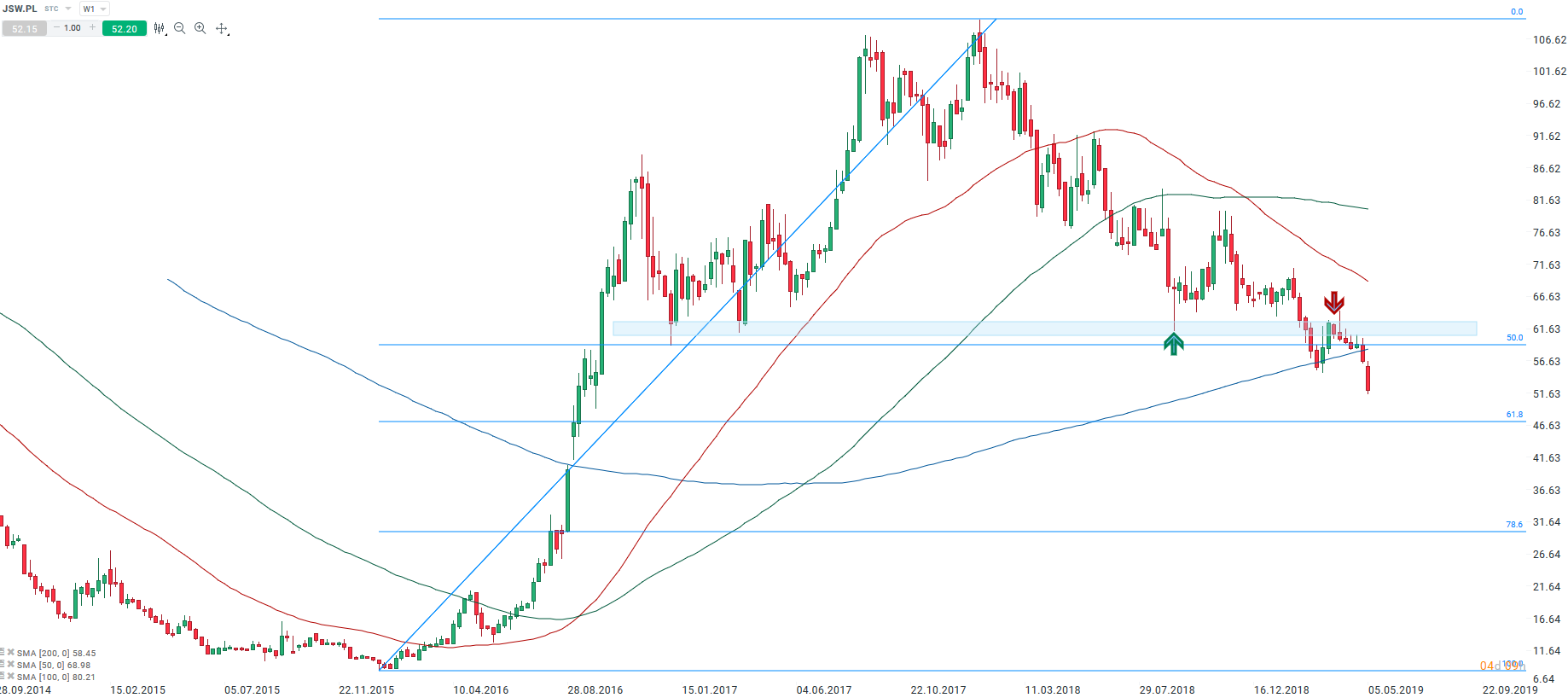 JSW po przełamaniu wsparcia w okolicy 60 złotych i wykonaniu ruchu powrotnego, kontynuuje spadki w stronę 50 złotych. Źródło: xStation5.