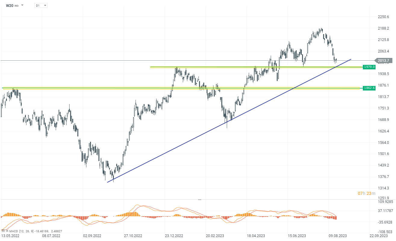 Pierwszy dzień tygodnia przynosi odreagowanie na większości indeksów w Europie i na otwarciu sesji w USA. Niemiecki DAX zyskuje niewiele ponad 0,30%, a indeksy w USA rosną odpowiednio 0,50% i 1,10% dla US500 oraz US100. WIG20 traci dzisiaj nieznacznie, bo -0,20%. Indeks walczy o utrzymanie psychologicznego poziomu 2000 pkt, który stanowił znaczący poziomu oporu pod koniec maja oraz poziom wsparcia na początku lipca. Jeśli byki nie zdołają utrzymać tej strefy to następnie można oczekiwać spadku w okolice 1950 pkt gdzie znajduje się kolejna linia wsparcia.