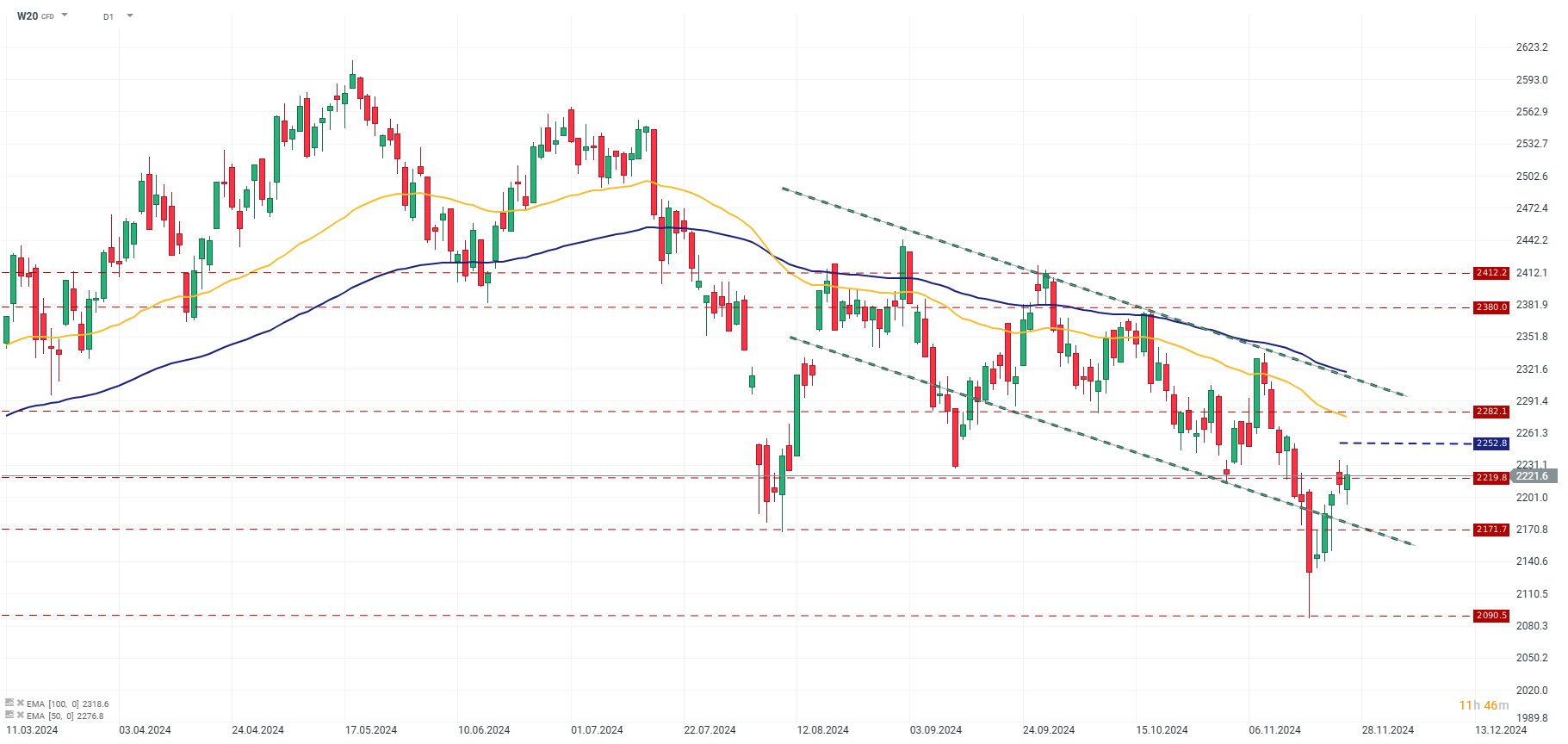 Notowania kontraktu na indeks WIG20 (W20) rosną dziś o 0,3%, walcząc z poziomem oporu wynoszącym 2220 pkt. W przypadku trwałego przebicia tej linii można spodziewać się kontynuacji ruchu do 2253 pkt., gdzie znajduje się teoretyczny zasięg korekty trendu spadkowego podobnej do tej z początku września. Jeśli jednak niedźwiedzie przeważą i notowania spadną poniżej 2220 pkt. uwaga inwestorów powinna zwrócić się na poziom 2171 pkt, który wyznacza wsparcia wzmocnione dolnym ograniczeniem trendu spadkowego. Źródło: xStation