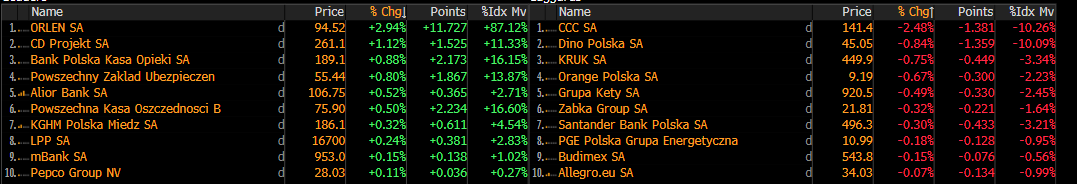 Spółki wchodzące w skład indeksu WIG20. Źródło: Bloomberg Finance L.P.