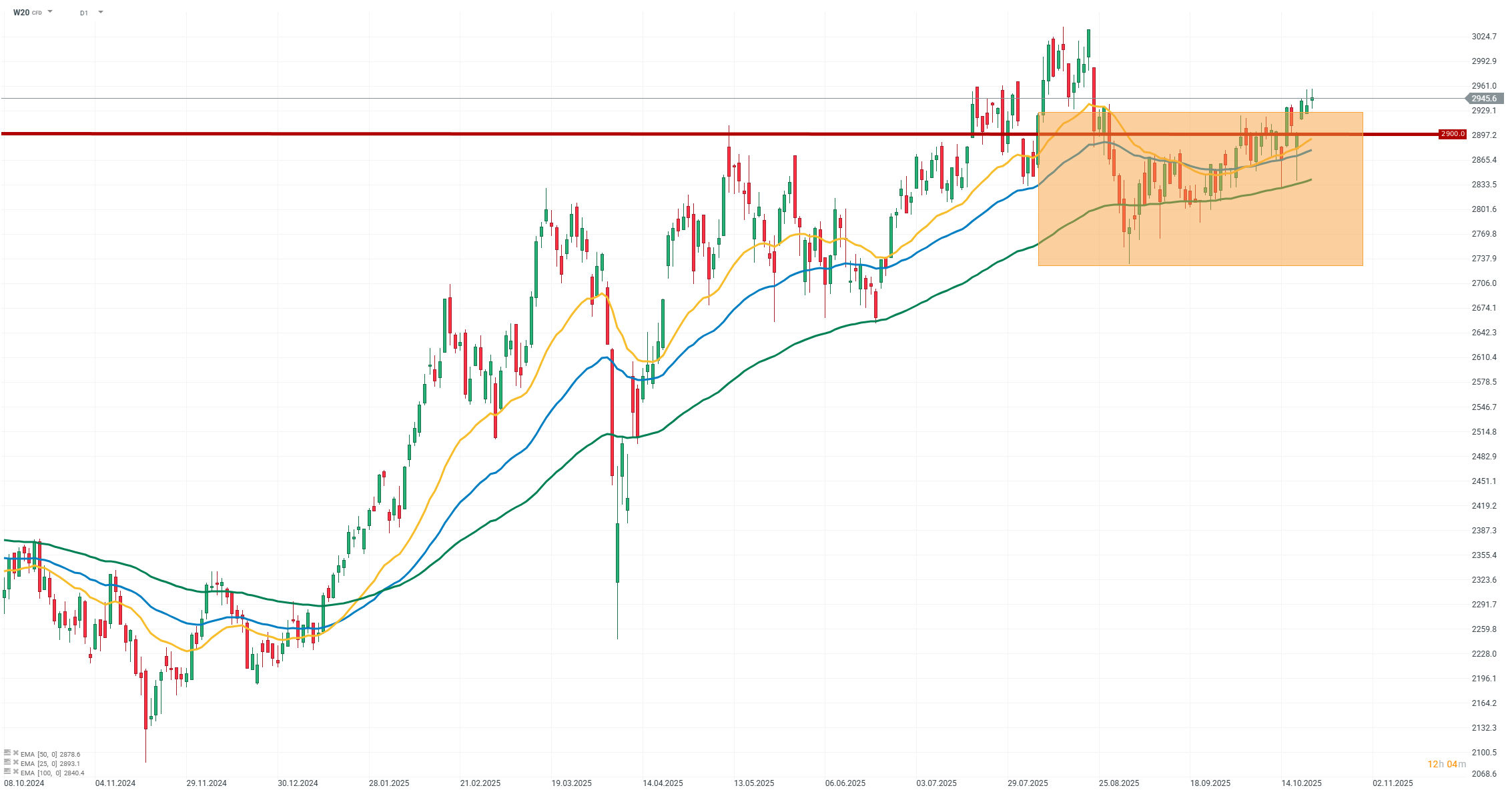 Notowania indeksu WIG20 ponownie przekroczyły poziom 2900 punktów. Kupującym sprzyjają relatywnie dobre informacje płynące z gospodarki, które wspierają wybicie z bocznej konsolidacji, w której indeks znajdował się ostatnio. Najważniejsze wykładnicze średnie kroczące znajdują się poniżej aktualnego poziomu notowań, co dodatkowo wzmacnia siłę wzrostów.