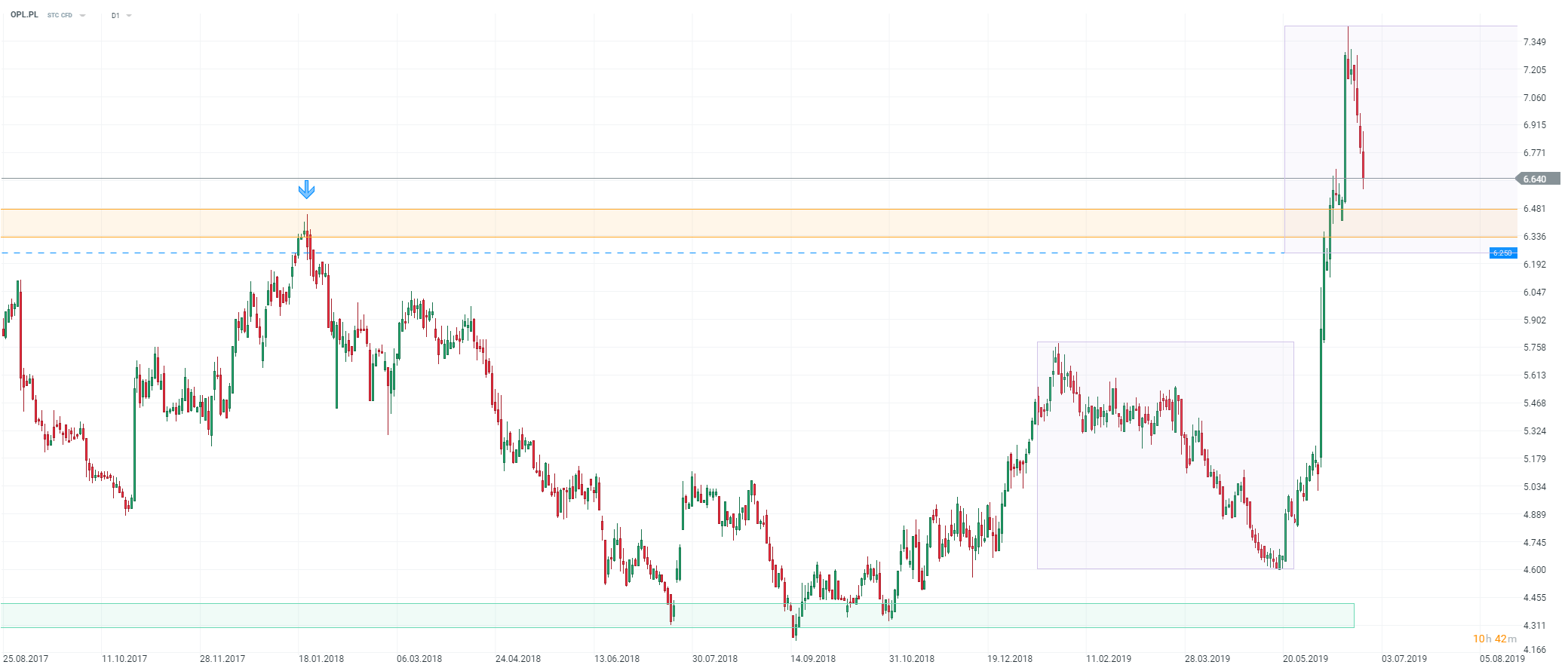 Orange PL (OPL.PL) jest jedną z nielicznych większych spółek, które znajdują się dziś na minusie. Jeżeli chodzi jednak o sytuację techniczną, to obecnie ruch spadkowy nie powinien być zagrożeniem dla trendu wzrostowego, jaki obserwujemy od początku roku. Patrząc na interwał D1, kluczowym wsparciem jest strefa przy 6,4 zł. Jako graniczny poziom, który powinien utrzymać wzrosty należy wziąć pod uwagę dolne ograniczenie układu 1:1, który wypada przy 6,25 zł. Dopóki kurs znajduje się powyżej - obowiązuje trend wzrostowy, a ruch który właśnie obserwujemy jest jedynie większa dynamiczniejsza korektą.