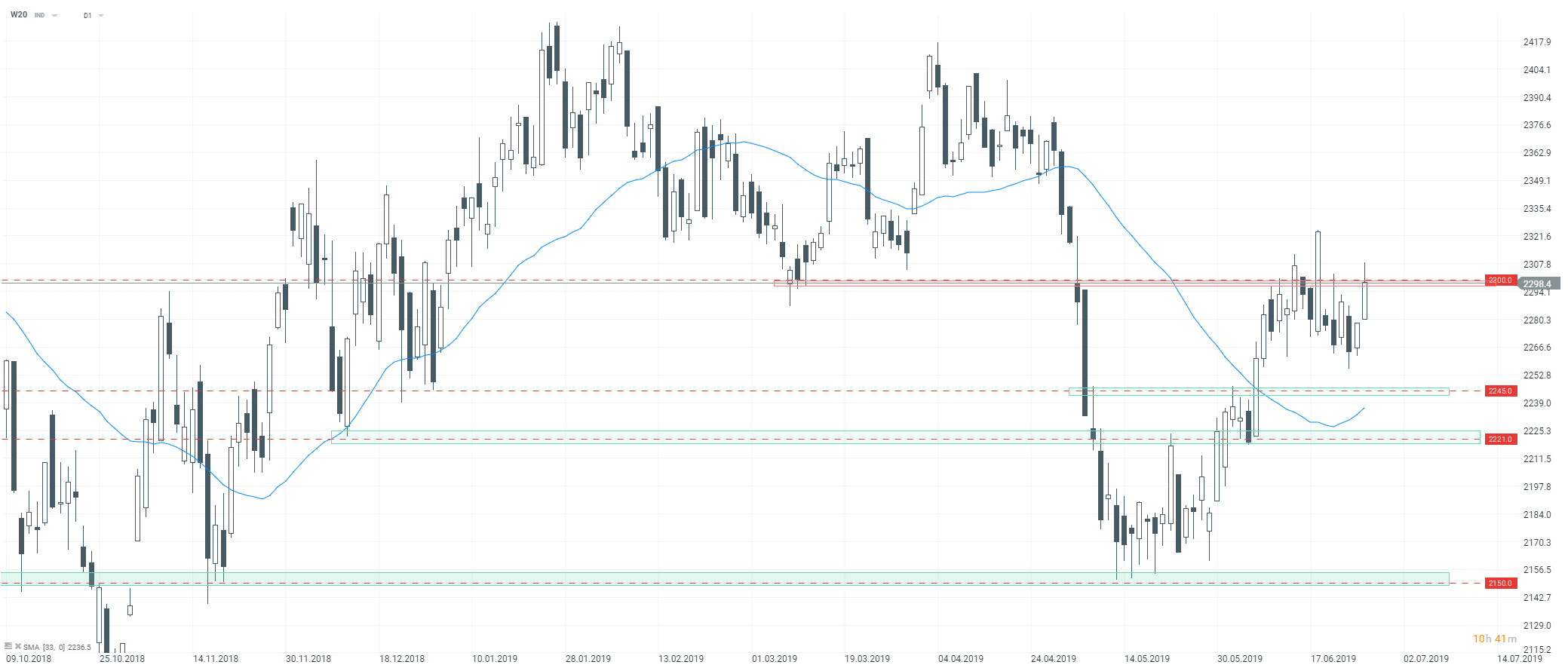 Jeżeli chodzi o sytuację techniczną na WIG20 (W20), to mamy do czynienia z próbą wybicia poziomu 2300 pkt. Jeżeli dzisiejsza sesja zamknie się powyżej, będzie to świadczyć o próbie podjęcia wzrostów. Tendencja od połowy maja jest wzrostowy, dlatego po ostatnich kilku dniach konsolidacji, indeks może wreszcie ruszyć w kierunku wyższych poziomów. Jeżeli jutro nastoje również będa pozytywne, to niewykluczony jest ruch nawet w kierunku poziomów z końcówki kwietnia - 2355 pkt. Oczywiście zawsze należy mieć na uwadze dwa scenariusze, dlatego, jeżeli rynek zdecydowałby się jednak na spadki, to ponownie należy wziąć pod uwagę wsparcie przy 2245 pkt oraz 2221 pkt.