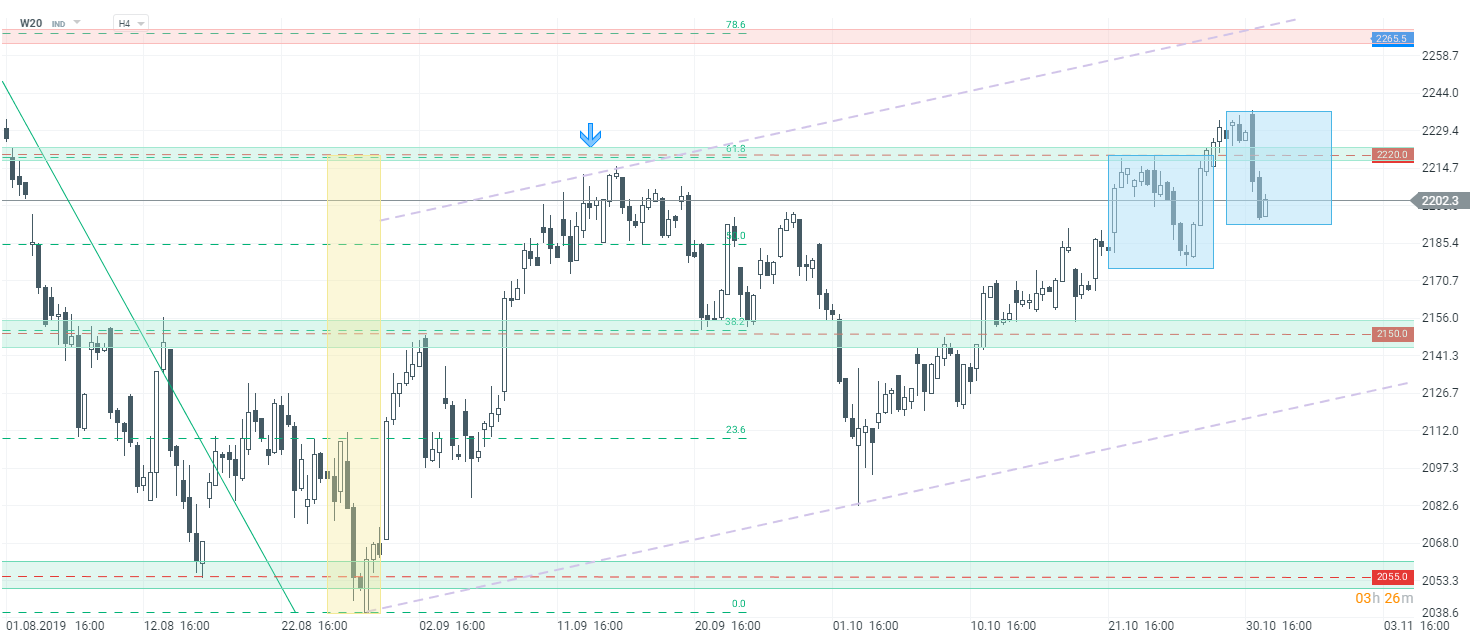 Dzisiejsza sesja przynosi nagły zwrot akcji. Po bardzo dobrym początku tego tygodnia, polski indeks WIG20 oddaje większość wypracowanego wzrostu. Tuż przed zamknięciem sesji spadki wynoszą 1,5%. Tym samym kontrakt W20 cofa poniżej ważnej strefy wsparcia, która odegrałą w ostatnim czasie kluczową rolę - 2220 pkt. Patrząc technicznie, najbliższym wsparciem jest dolne ograniczenie układu 1:1. Niemniej w przypadku jego pokonania, istnieje szansa na ponowne zejście w kierunku strefy przy 2150 pkt.