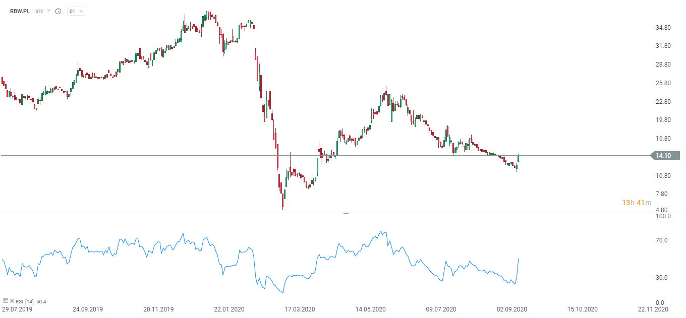 Wczoraj doszło do silnego odbicia cen akcji operatora wycieczek Rainbow Tours (RBW.PL). Jak widać na wykresie akcje spółki po odbiciu z początku pandemii, od pierwszej połowy czerwca straciły na wartości do wczorajszego dnia ponad 55%. Wczoraj akcje należały do liderów na GPW, a dzisiaj jest to najmocniej zyskująca spółka o poranku z szerokiego rynku, zyskująca niemal 11%.
