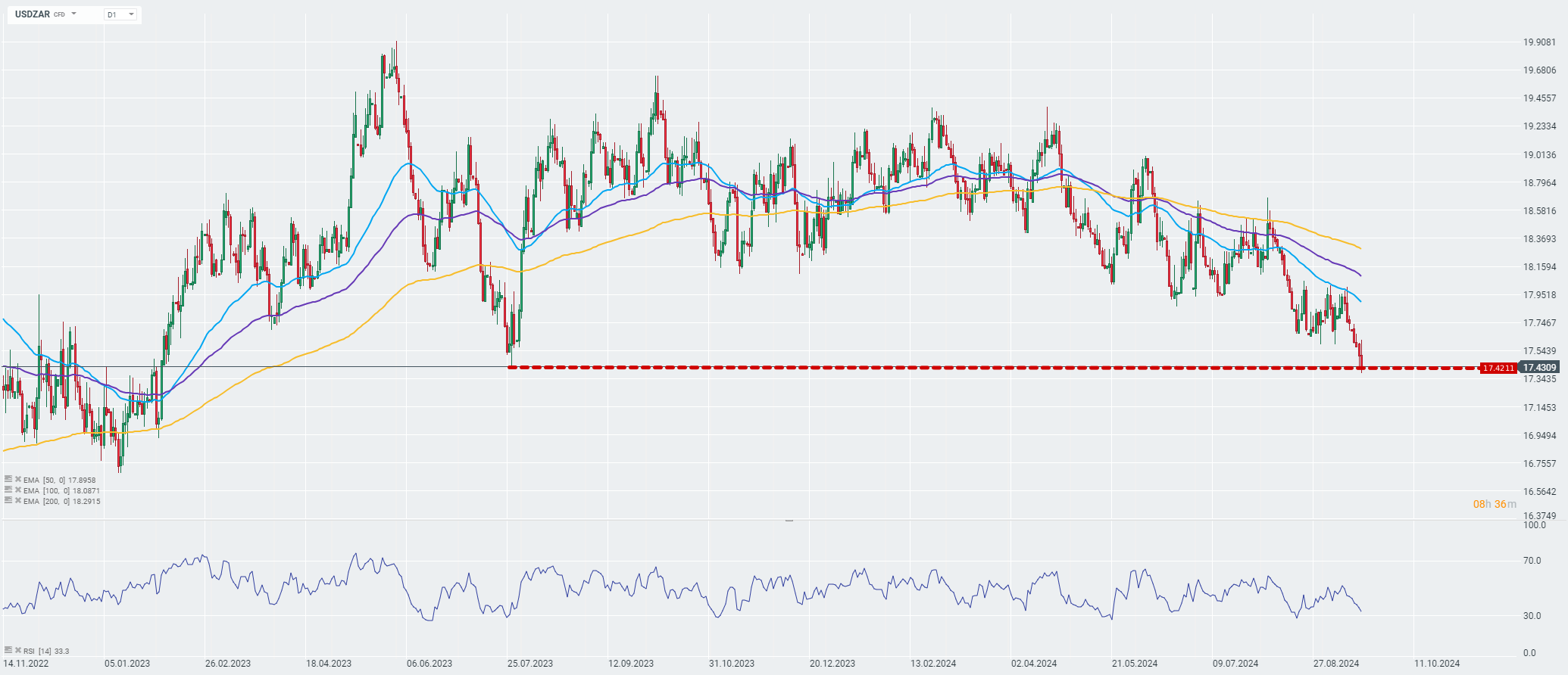 Notowania pary USDZAR kontynuują ruch spadkowy, po tym, jak bank centralny Południowej Afryki (SARB) zadecydował obniżyć stopę repo po raz pierwszy od 2020 roku do 8% z 8,25%. Bank oczekuje, że w 2025 roku średnia wartości inflacji CPI sięgnie 4,1% wobec oczekiwań wcześniejszych na poziomie 4,4%.