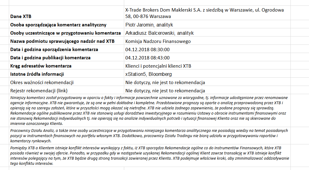 Ta publikacja handlowa jest informacyjna i edukacyjna. Nie jest rekomendacją inwestycyjną ani informacją rekomendującą lub sugerującą strategię inwestycyjną. W materiale nie sugerujemy żadnej strategii inwestycyjnej ani nie świadczymy usługi doradztwa inwestycyjnego. Materiał nie uwzględnia indywidualnej sytuacji finansowej, potrzeb i celów inwestycyjnych klienta. Nie jest też ofertą sprzedaży ani subskrypcji. Nie jest zaproszeniem do nabycia, reklamą ani promocją jakichkolwiek instrumentów finansowych. Publikację handlową przygotowaliśmy starannie i obiektywnie. Przedstawiamy stan faktyczny znany autorom w chwili tworzenia dokumentu. Nie umieszczamy w nim żadnych elementów oceniających. Informacje i badania oparte na historycznych danych lub wynikach oraz prognozy nie stanowią pewnego wskaźnika na przyszłość. Nie odpowiadamy za Twoje działania lub zaniechania, zwłaszcza za to, że zdecydujesz się nabyć lub zbyć instrumenty finansowe na podstawie informacji z tej publikacji handlowej. Nie odpowiadamy też za szkody, które mogą wynikać z bezpośredniego czy też pośredniego wykorzystania tych informacji. Inwestowanie jest ryzykowne. Inwestuj odpowiedzialnie.