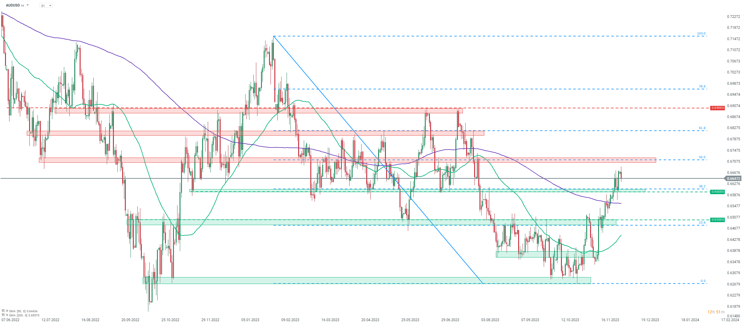 Spoglądając na wykres AUDUSD na interwale D1 widzimy, że para doświadczyła ostatnio silnego ruchu w górę, który był napędzany w dużej mierze przez osłabienie USD. Para jest notowana 6% powyżej minimów z końca października 2023 roku. Dziś na parze można zaobserwować cofnięcie. Para była ostatnio napędzana przez USD i prawdopodobnie tak pozostanie. Jeśli jednak RBA przedstawi jutro jastrzębie uwagi w swoim oświadczeniu, zyski na parze mogą przyspieszyć. W takim scenariuszu pierwszą krótkoterminową strefą oporu, na którą warto zwrócić uwagę, może być okolica 50% zniesienia ruchu spadkowego rozpoczętego na początku lutego 2022 roku.