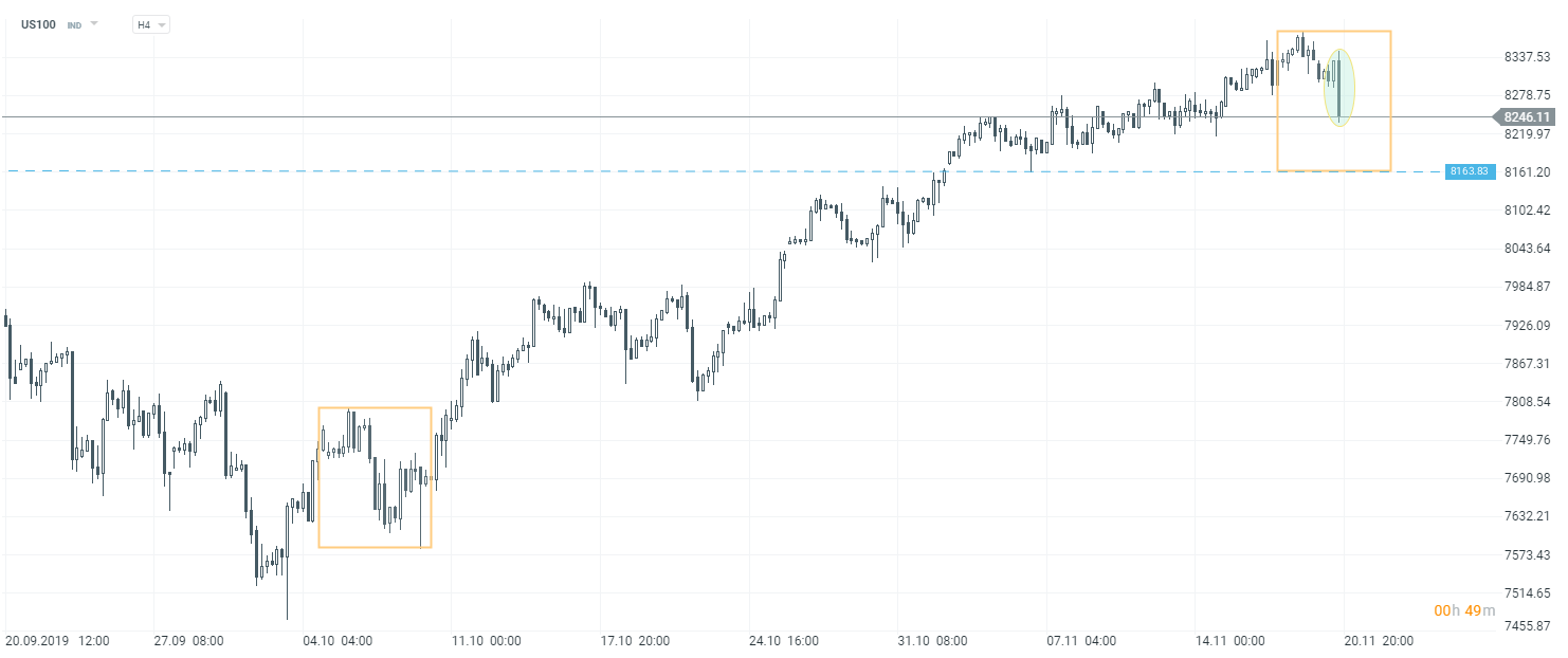 Po publikacji raportu obserwujemy wyraźne spadki na rynku akcji, kapitał kieruje się w stronę bezpieczniejszych aktywów. Patrząc technicznie, technologiczny indeks Nasdaq (US100) ma szansę na zejście w rejony dolnego ograniczenia układu Overbalance.