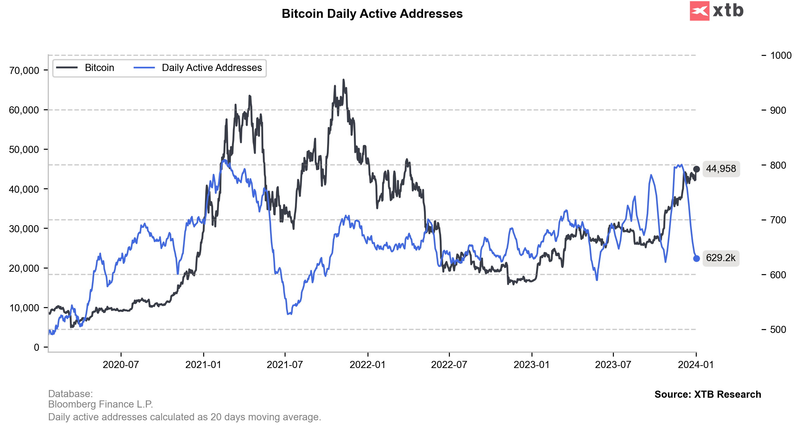 Aktywność onchain adresów Bitcoinowych od pierwszej połowy grudnia dynamicznie spadła, co historycznie wskazywało na spadek dynamiki dokonywanych transakcji bądź okresy spadku zainteresowania kryptowalutą. Źródło: XTB Research