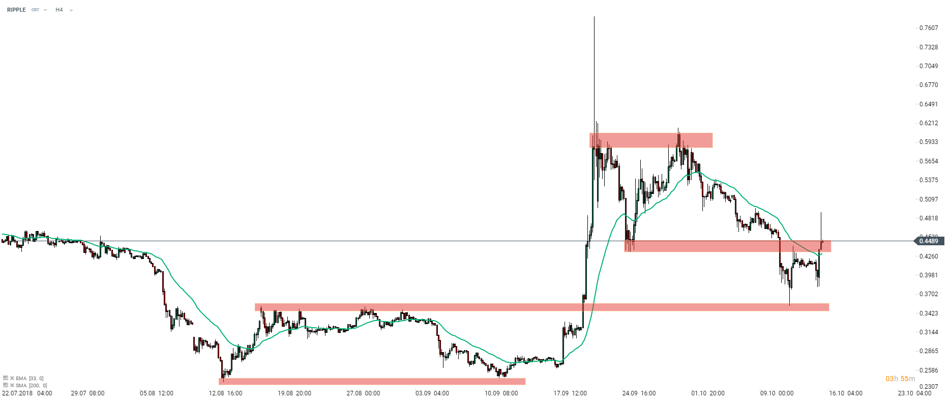 Dzisiejszego poranka RIPPLE przełamał w górę strefę oporu ($0.435-0.450) w czasie, gdy rósł wraz z wieloma innymi kryptowalutami. Spadek, który nastąpił niedługo potem, cofnął jednak walutę wirtualną do wspomnianej wcześniej strefy. Niemniej jednak RIPPLE powoli kontynuuje ruch wzrostowy i być może skończy dzisiejszy dzień powyżej tejże strefy. Źródło: xStation5.