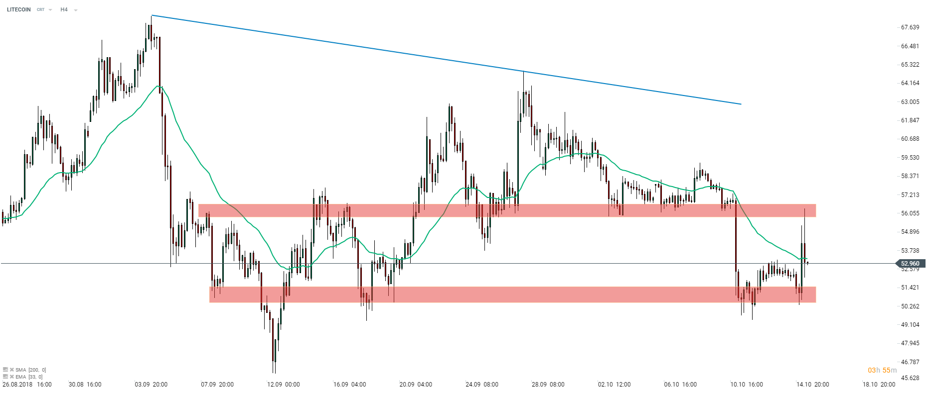 LITECOIN, podobnie jak Bitcoin, poszedł w górę o poranku, jednak nie dał rady przełamać strefy oporu. W następnej kolejności waluta cyfrowa powróciła poniżej 33-okresowej średniej kroczącej (zielona linia na wykresie). Źródło: xStation5.