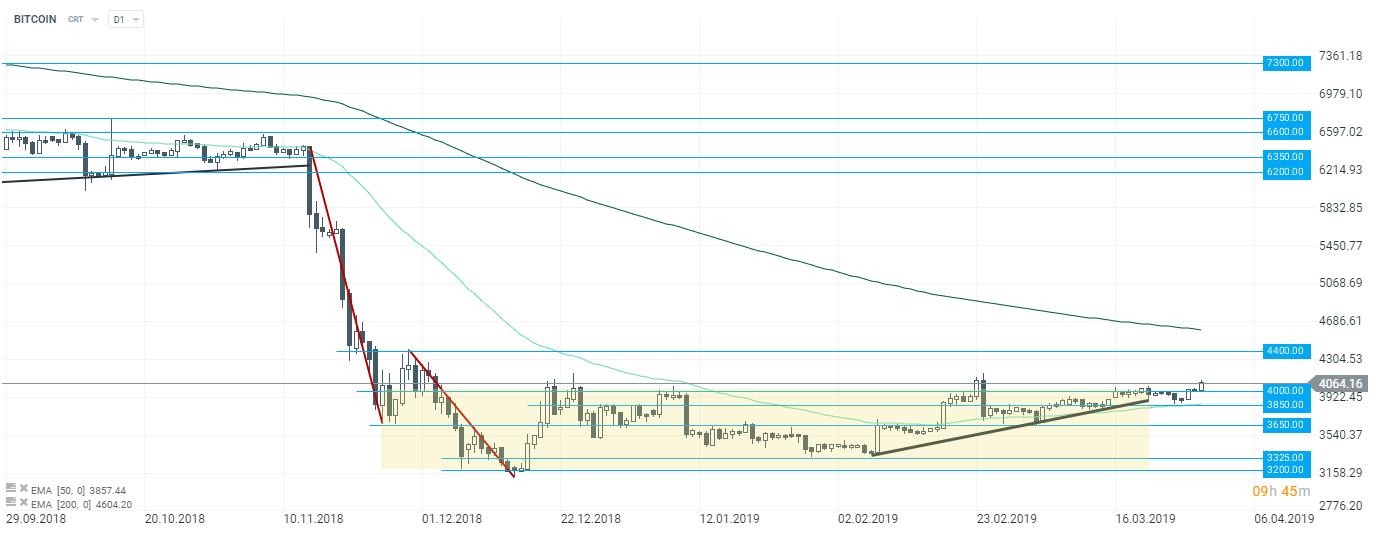Bitcoin (BITCOIN na xStation5) doświadczył wyraźnego wzrostu podczas pierwszej części dzisiejszego handlu. Do około godziny czternastej ajwiększa kryptowaluta wzrosła do około 4050 dolarów, co jest miesięcznym maksimum Bitcoina. Źródło: xStation5.