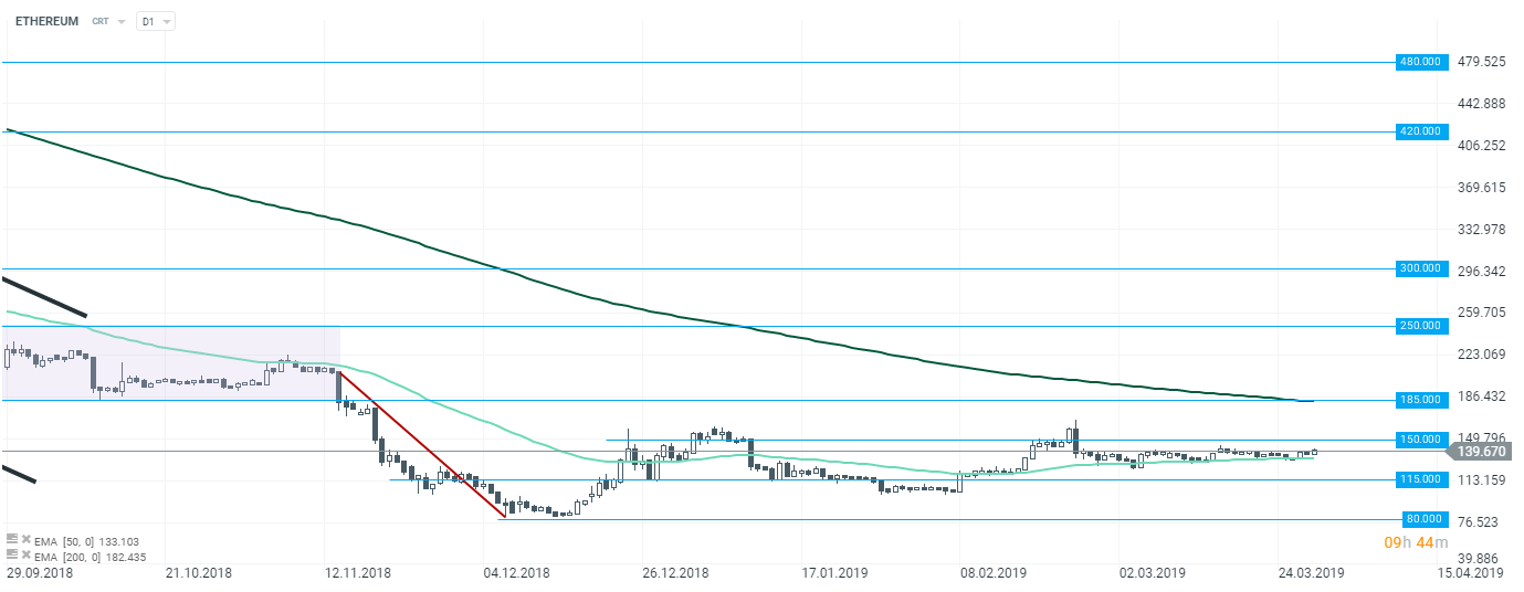 Ethereum (ETHEREUM na xStation5) spadł podczas wczorajszego handlu, jednak kryptowaluta dała radę odrobić czwartkową stratę podczas piątkowego handlu do około godziny czternastej. W tym samym czasie druga największa waluta wirtualna znajduje się nieco poniżej poziomu 140 dolarów. Źródło: xStation5