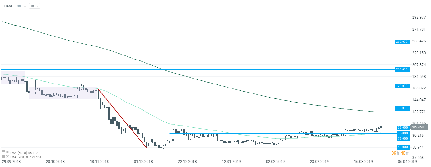 Dash (DASH na xStation5) zanotował dzisiaj wzrost do około godziny czternastej. Zauważmy, że Dash doświadczył wczoraj zauważalnej byczej świecy w środę, jednak rósł również podczas wczorajszego handlu. Co więcej, waluta wirtualna osiągnęła dzisiaj swoje trzymiesięczne maksimum. Źródło: xStation5.