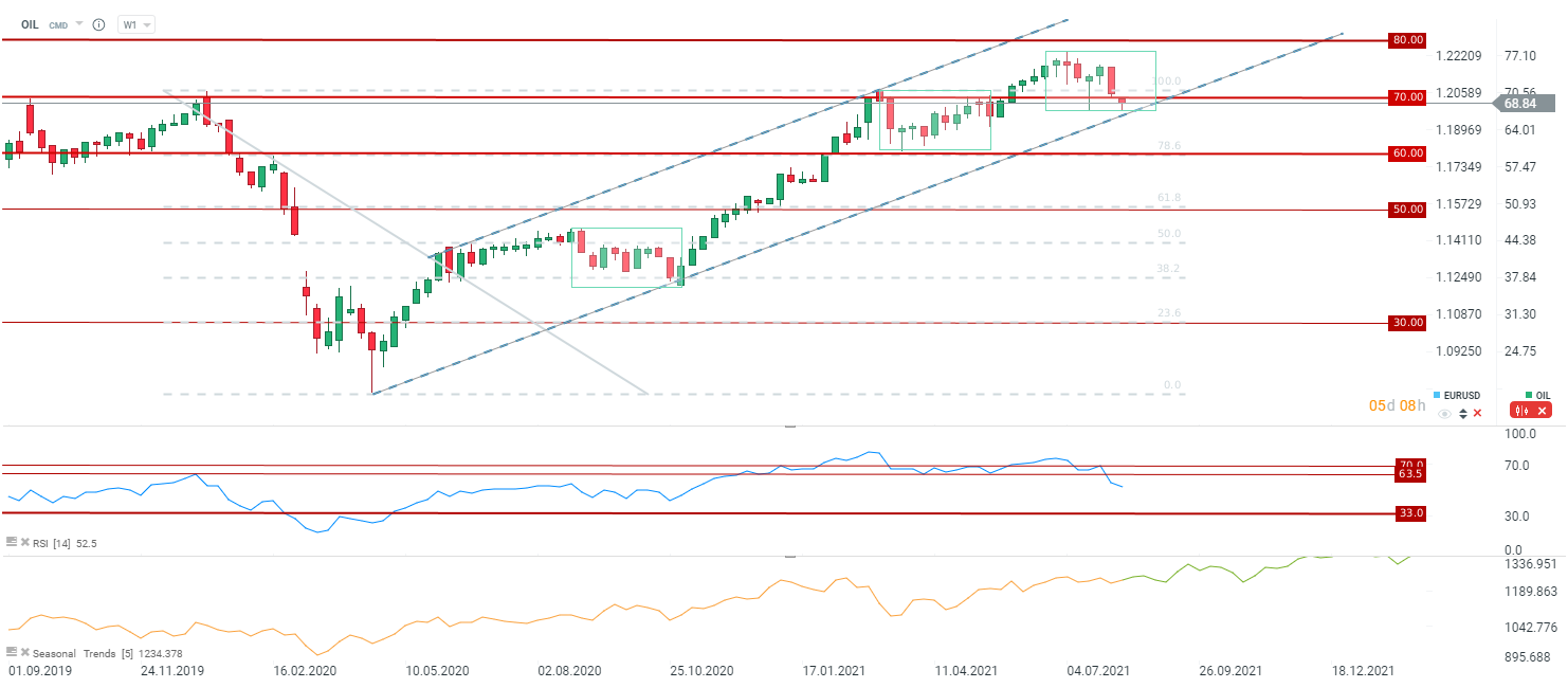 Kurs OIL tracił dziś nawet około 4%, przez co cena przetestowała wsparcie wynikające z dolnego ograniczenia struktury 1:1, jak i linii trendu wzrostowego (interwał W1). Ceny ropy spadły już o ponad 12% od szczytu z początku lipca. Poziom 60 USD za baryłkę, który zbiega się z poziomem 78,6% zniesienia Fibonacciego, może posłużyć jako kolejne istotne wsparcie, jeśli spadki byłyby kontynuowane. Źródło: xStation5