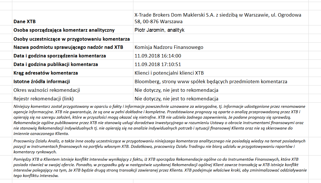 Ta publikacja handlowa jest informacyjna i edukacyjna. Nie jest rekomendacją inwestycyjną ani informacją rekomendującą lub sugerującą strategię inwestycyjną. W materiale nie sugerujemy żadnej strategii inwestycyjnej ani nie świadczymy usługi doradztwa inwestycyjnego. Materiał nie uwzględnia indywidualnej sytuacji finansowej, potrzeb i celów inwestycyjnych klienta. Nie jest też ofertą sprzedaży ani subskrypcji. Nie jest zaproszeniem do nabycia, reklamą ani promocją jakichkolwiek instrumentów finansowych. Publikację handlową przygotowaliśmy starannie i obiektywnie. Przedstawiamy stan faktyczny znany autorom w chwili tworzenia dokumentu. Nie umieszczamy w nim żadnych elementów oceniających. Informacje i badania oparte na historycznych danych lub wynikach oraz prognozy nie stanowią pewnego wskaźnika na przyszłość. Nie odpowiadamy za Twoje działania lub zaniechania, zwłaszcza za to, że zdecydujesz się nabyć lub zbyć instrumenty finansowe na podstawie informacji z tej publikacji handlowej. Nie odpowiadamy też za szkody, które mogą wynikać z bezpośredniego czy też pośredniego wykorzystania tych informacji. Inwestowanie jest ryzykowne. Inwestuj odpowiedzialnie.