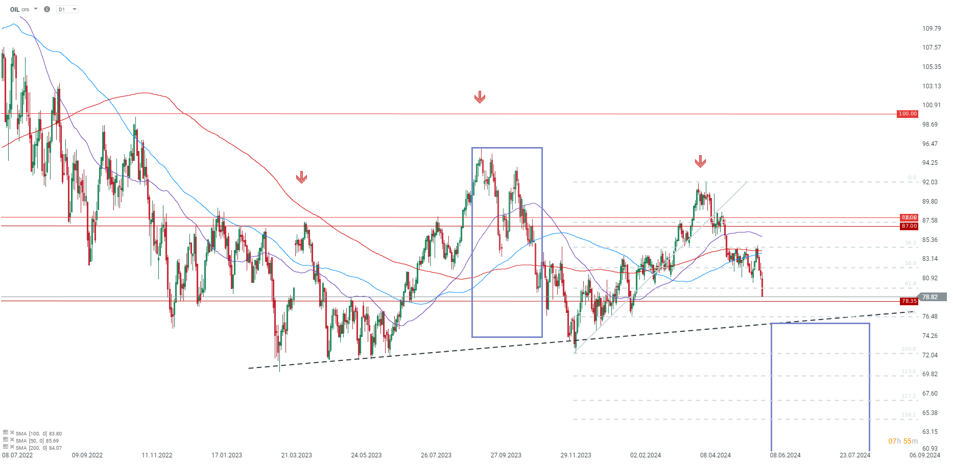Ropa Brent zalicza głębszy spadek podczas ostatniej godziny, notując poziomy poniżej 80 USD za baryłkę. Jest to efekt kilku czynników, choć przede wszystkim decyzji OPEC+. Ropie ciąży decyzja o stopniowym podnoszeniu produkcji od października, choć wiele instytucji nie jest pewnych, co do odpowiedniego ożywienia w popycie. Co więcej, po dzisiejszych danych ISM z USA rynek może mieć jeszcze większe obawy dotyczące siły popytowej w USA. Kluczowe wsparcie na ropie Brent znajduje się w okolicach 75-76 USD za baryłkę.