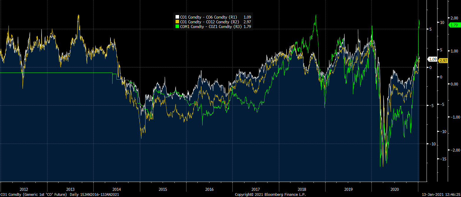 Spread styczeń-czerwiec (biała linia), spread styczeń grudzień (żółta linia), spread czerwiec-grudzień (zielona linia). Źródło: Bloomberg