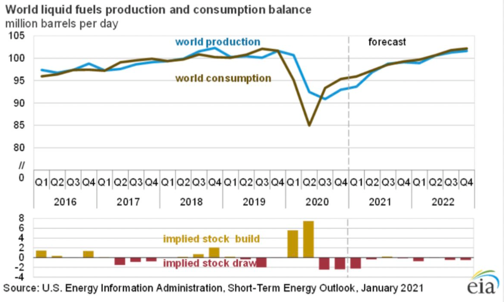 EIA widzi spory deficyt na rynku w pierwszej połowie tego roku, a następnie zbilansowanie popytu i podaży do końca 2022 roku. Źródło: EIA