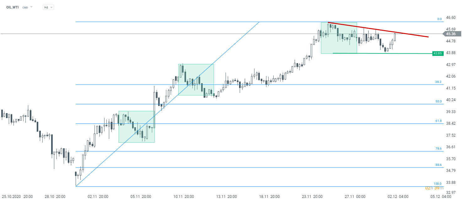 Na ropie możemy obserwować pozytywna reakcję nn rane.Aktualnie Brent znajduje się 2,3% wyżej, a WTI notuje +2,6%. Patrząc na wykres OIL.WTI notowania testują linię poprowadzoną po ostatnich lokalnych wierzchołkach. W przypadku jej pokonania, ruch w górę pomoże przyspieszyć.