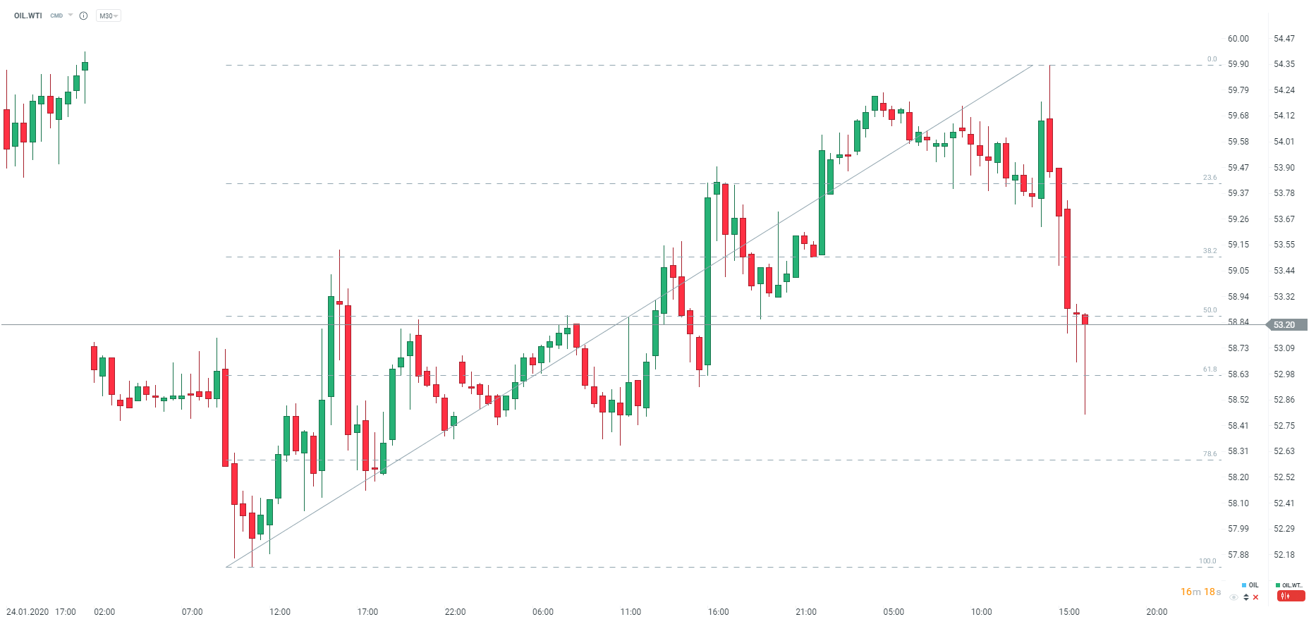Ropa momentalnie pogłębiła spadek w trakcie publikacji raportu. Z drugiej strony widać działanie popyt poniżej 53 USD za baryłkę. Źródło: xStation5
