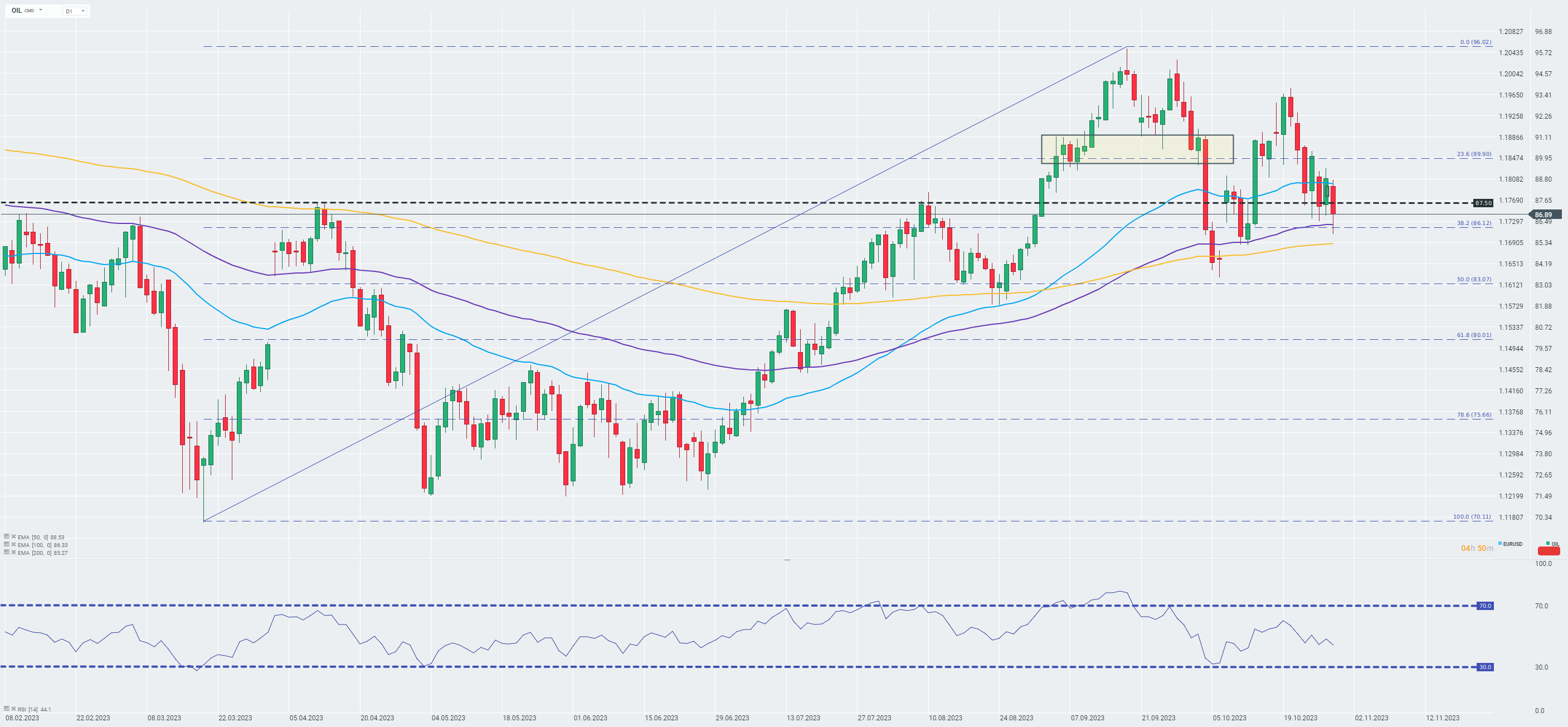 Ropa naftowa (OIL) traci ponad 2% podczas pierwszej w tym tygodniu sesji giełdowej i notowana jest poniżej strefy 87 dolarów za baryłkę. Inwestorzy są bardziej optymistyczni po tym, jak izraelska ofensywa okazała się mniej agresywna niż początkowo oczekiwano. Jak jednak zauważa USA, ryzyko eskalacji konfliktu i zaangażowania innych państw regionu jest naprawdę wysokie. Kolejnym powodem do optymizmu wydaje się być zbliżająca się decyzja Rezerwy Federalnej, gdzie utrzymanie obecnego poziomu stóp procentowych jest niemal pewne. Co więcej, inwestorzy są coraz bardziej przekonani, że cykl podwyżek stóp mamy już za sobą.