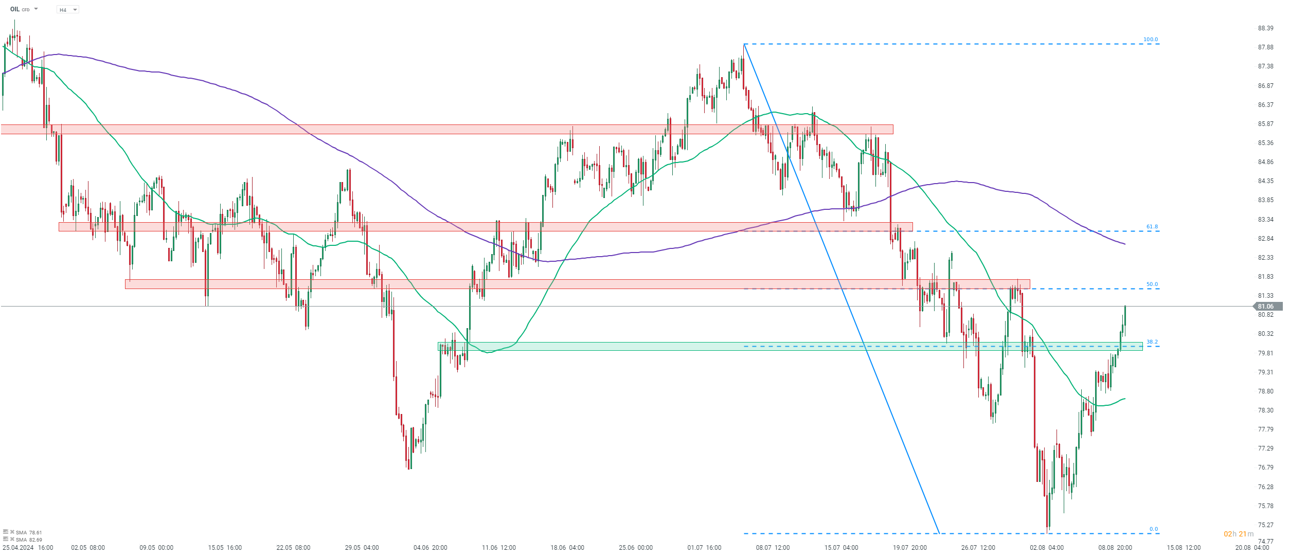 Spoglądając na wykres ropy naftowej na interwale H4, widzimy, że cena znajduje się około 8% powyżej minimów z zeszłego tygodnia i przebija poziom 81 USD za baryłkę w momencie publikacji. Potencjalną krótkoterminową strefę oporu, którą należy obserwować, można znaleźć w obszarze 81,50 USD, gdzie znajduje się 50% zniesienie ruchu spadkowego rozpoczętego na początku lipca.