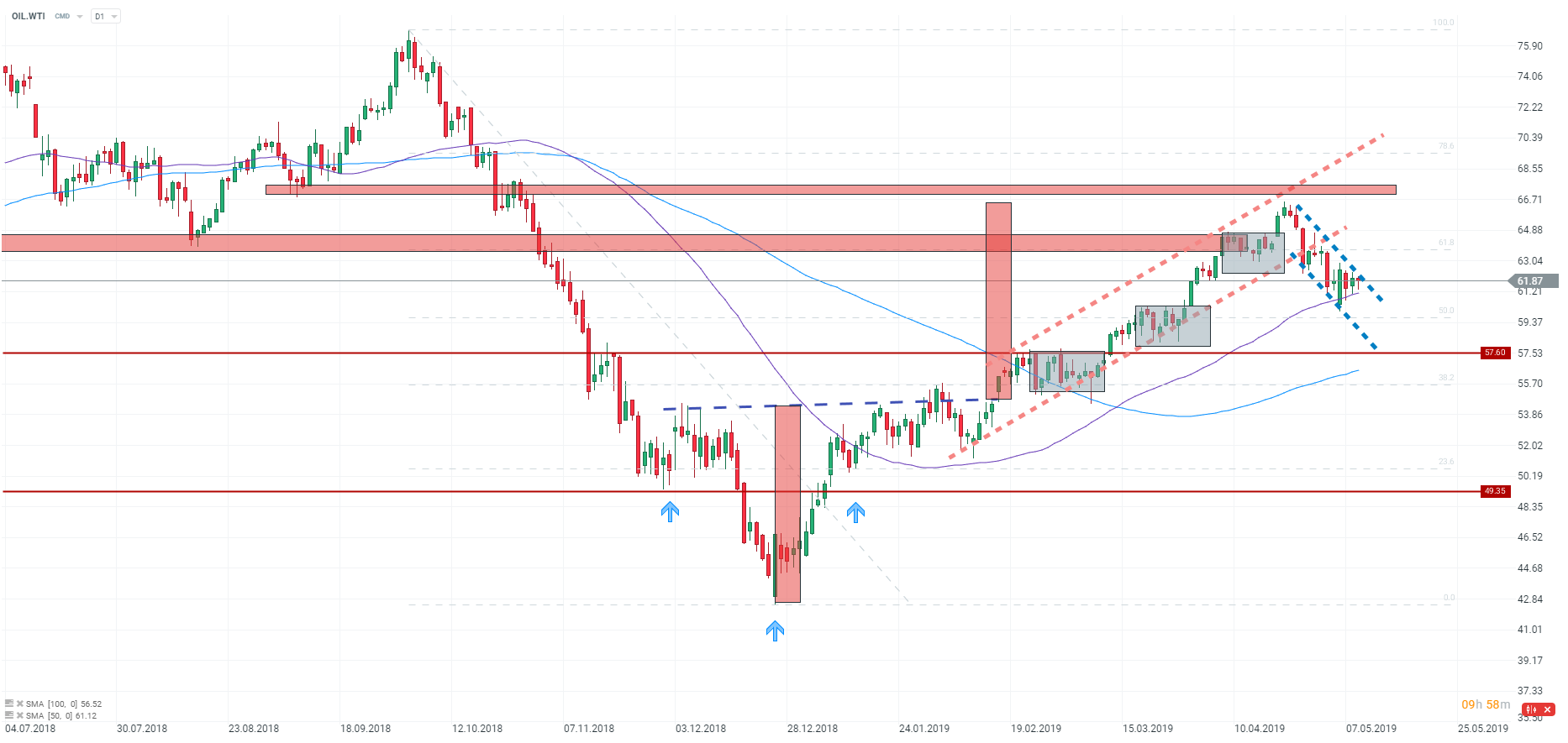 Oczywiście inwestorzy nie powinni zapominać o głównym motorze napędowym ropy naftowej, czyli o kwestiach podażowych. OPEC wciąż zmniejsza produkcję ropy naftowej, Iran oraz Wenezuela obniżają produkcję w związku z czynnikami geopolitycznymi, a Stany Zjednoczone szykują się do sezonu letniego, który zwiększy popyt na ropę oraz produkty ropopochodne ze strony konsumentów.
