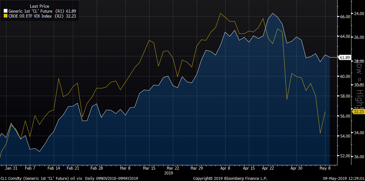 Indeks VIX dla ropy naftowej, czyli indeks zmienności czy indeks strachu znacząco zyskał od początku tego tygodnia. W zasadzie od końca kwietnia mamy do czynienia ze wzrostem o ok. 7-8 punktów. Inwestorzy wciąż nie mogą zdecydować się na to, jaki kierunek obrać przed końcem tego tygodnia, kiedy to może dojść do możliwego nałożenia nowych taryf celnych na Chiny, co byłoby mocnym zagrożeniem dla światowego popytu na ropę.