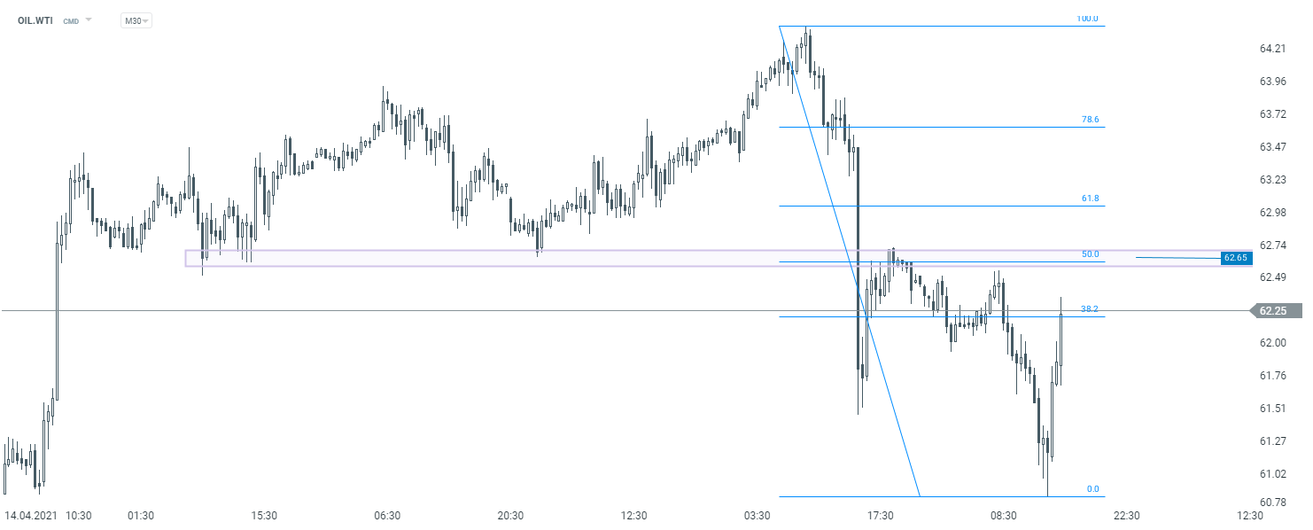 W pierwszej połowie dnia mogliśmy obserwować spadki na ropie naftowej, niemniej po godzinie 15:00 inicjatywę przejęli kupujący. Wzrosty są także kontynuowane po godzinie 16:30, czyli po publikacji danych o zapasach. Szacunki rynkowe zakładały spadek zapasów ropy o 3,2 miliona baryłek, podczas gdy wzrosły one o 0,6 mln brk (poprzednio -5,9 mln). Patrząc technicznie na wykres OIL.WTI na interwale M30, kluczowym oporem pozostaje jednak strefa przy 62,65$. Obszar zaznaczony kolorem fioletowym wynika z wcześniejszych reakcji cenowych oraz mierzenia 50% ostatniej fali spadkowej.